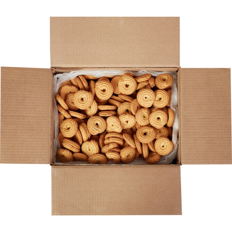 Печенье Яшкино. Ванильное кольцо - это оригинальное и вкусное сдобное песочное печенье с рассыпчатой структурой и ароматом ванили, в интересной форме кольца. Состав: мука пшеничная общего назначения, маргарин (рафинированные дезодорированные масла в натуральном и модифицированном виде (подсолнечное масло, пальмовое масло), вода, эмульгаторы (Е471, Е322), соль поваренная пищевая, краситель (Е160а), ароматизатор, регулятор кислотности: лимонная кислота), сахар, яйцо куриное, сыворотка сухая молочная, соль поваренная пищевая, разрыхлители: гидрокарбонат натрия, карбонаты аммония; ароматизатор ванилин; вода питьевая. Пищевая ценность на 100 г продукта: белки - 6,5 г, жиры - 29 г, углеводы - 58 г. Энергетическая ценность на 100 г продукта: 520 ккал. Вес: 3,5 кг. Тип упаковки: картонная. Срок годности: 4 месяца. Условия хранения: при температуре от 13 до 21 °С.