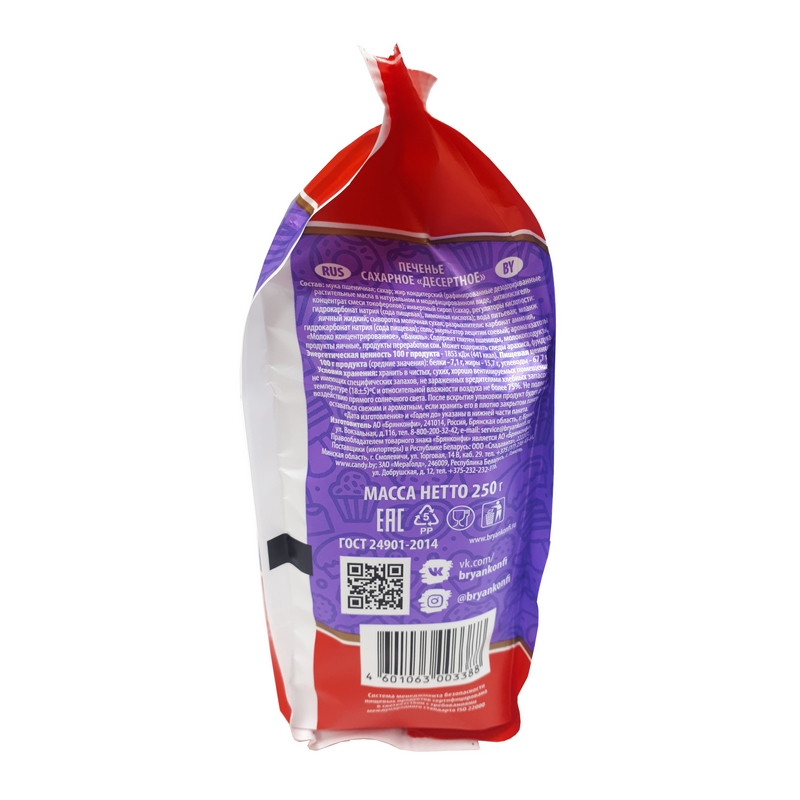 Печенье сахарное Брянконфи ?Десертное? 250 г - мелкое печенье, посыпанное сахаром и политое сиропом, в яркой, красочной упаковке. Состав: мука пшеничная, сахар, жир кондитерский (рафинированные дезодорированные растительные масла в натуральном и модифицированном виде, антиокислитель концентрат смеси токоферолов), инвертный сироп (сахар, регуляторы кислотности: гидрокарбонат натрия (сода пищевая), лимонная кислота); вода питьевая, меланж яичный жидкий; сыворотка молочная сухая,разрыхлители: карбонат аммония, гидрокарбонат натрия (сода пищевая); соль; эмульгатор лецитин соевый; ароматизаторы ?Молоко концентрированное?, ?Ваниль?. Пищевая ценность: белки - 7.1 г, жиры - 15.1 г, углеводы - 67.7 г. Энергетическая ценность: 441 ккал. Хранить в чистых, сухих, хорошо вентилируемых помещениях, не имеющих специфических запахов, не зараженных вредителями, при температуре от 13 до 23°С и относительной влажности воздуха не более 75%. Не подвергать воздействию прямого солнечного света. Страна производства: Россия. ГОСТ 24901-2014.