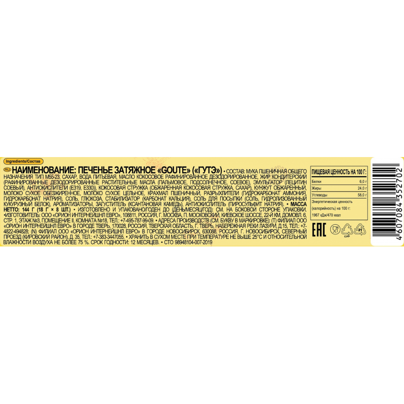 Печенье ?Goute? - это изящное тонкое печенье, вкус которого гармонично сочетает в себе нотки кунжута и кокоса. Печенье Goute станет отличным дополнением к чашечке кофе за завтраком или отличным поводом собрать коллег на чаепитие в перерыве между работой. Состав: мука пшеничная общего назначения тип м55-23, сахар, вода питьевая, масло кокосовое рафинированное дезодорированное, жир кондитерский соевый (рафинированные дезодорированные растительные масла (пальмовое, подсолнечное, соевое), эмульгатор (лецитин соевый), антиокислители (E319, E330)), кокосовая стружка (обжаренная кокосовая стружка, сахар), кунжут обжаренный, молоко сухое обезжиренное, молоко сухое цельное, крахмал пшеничный, разрыхлители (гидрокарбонат аммония, гидрокарбонат натрия), соль, глюкоза, стабилизатор (карбонат кальция), соль для посыпки (соль гидролизованный кукурузный белок), ароматизаторы, загуститель (ксантановая камедь), антиокислитель (пиросульфит натрия). Пищевая ценность на 100 г: белки - 6 г; жиры - 24 г; углеводы - 58 г. Энергетическая ценность на 100 г: 470 ккал. Срок годности: 12 месяцев. Хранить в сухом месте при температуре не выше 25°С и относительной влажности воздуха не более 75%. Масса нетто: 144 г. Тип упаковки: картонная. Страна производства: Россия.