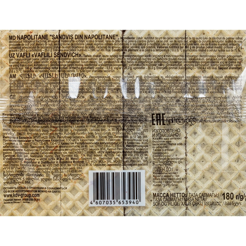 Вафли Яшкино. Вафельный сэндвич - это лакомство, которое не только содержит натуральные и вкусные ингредиенты, но и несет заряд хорошего настроения. Разделите удовольствие от него с близкими! Состав: кондитерская глазурь (сахар-песок, заменитель масла какао нетемперируемый лауринового типа, какао-порошок, молоко сухое цельное, тертое какао, эмульгатор - лецитин, ароматизатор, ванилин), вафельный лист (вода питьевая, мука пшеничная в/с, крахмал кукурузный, яичный порошок, соль поваренная пищевая, жир растительный дезодорированный рафинированный, разрыхлители - гидрокарбонат натрия, карбонаты аммония, эмульгатор - лецитин, комплексный пищевой компонент Альфамат (фермент протеаза) - улучшитель муки). Без ГМО. Пищевая ценность на 100 г продукта: белки - 5.5 г, жиры - 27.0 г, углеводы - 60.0 г. Энергетическая ценность на 100 г продукта: 510 ккал. Вес: 3.8 кг. Тип упаковки: картонная. Срок годности: 8 месяцев. Условия хранения: при температуре от 3 до 18 °С.