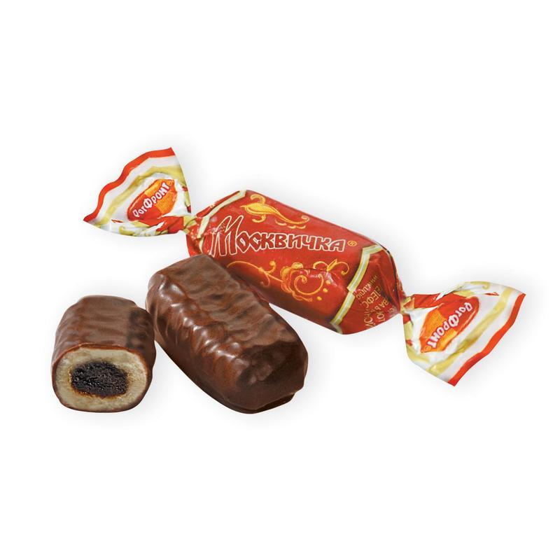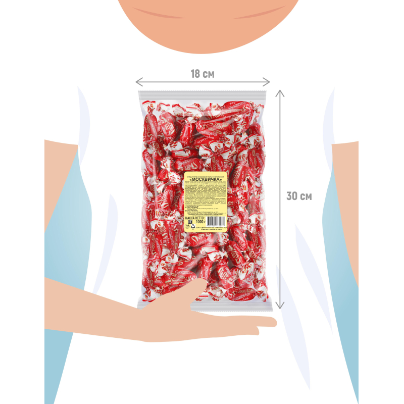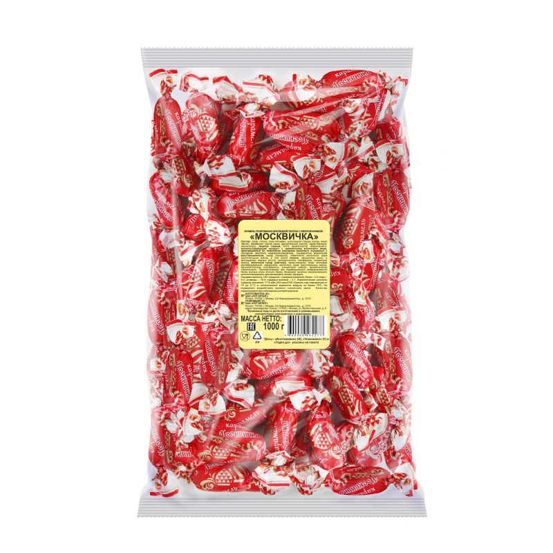 Знаменитая конфета 'Москвичка' - покрытая шоколадной глазурью хрустящая карамель с мягкой ликерной начинкой. Утонченное сочетание сливочного вкуса карамели с яркими оттенками какао, ванили и терпкими алкогольными нотками. Каждая грань вкуса 'Москвички' раскрывается по-своему, дополняя другие оттенки. Состав: сахар, патока, вода питьевая, шоколадная глазурь (сахар, какао тертое, эквивалент масла какао (рафинированные, дезодорированные фракционированные, негидрогенизированные растительные масла (пальмовое, ши), какао-порошок, эмульгаторы: лецитин соевый, Е476, ароматизатор Ванильный), сгущенное с сахаром молоко (цельное молоко, сахар), какао-порошок, спирт этиловый ректификованный, заменитель молочного жира (рафинированные дезодорированные растительные масла: частично гидрогенизированное растительные масла (пальмовое масло, подсолнечное масло, пальмоядровое масло), антиокислитель токоферолы, концентрат смеси), ароматизатор Ванильный. Противопоказано при индивидуальной непереносимости белка молока. Пищевая ценность в 100 г продукта: белки - 3 г, жиры - 9 г, углеводы - 79 г, пищевый волокна 2,1 г. Энергетическая ценность в 100 г продукта: 410 ккал/1740 кДж. Хранить при температуре от +15°С до +21°С и относительной влажности воздуха не более 75 %. Не подвергать воздействию прямого солнечного света.