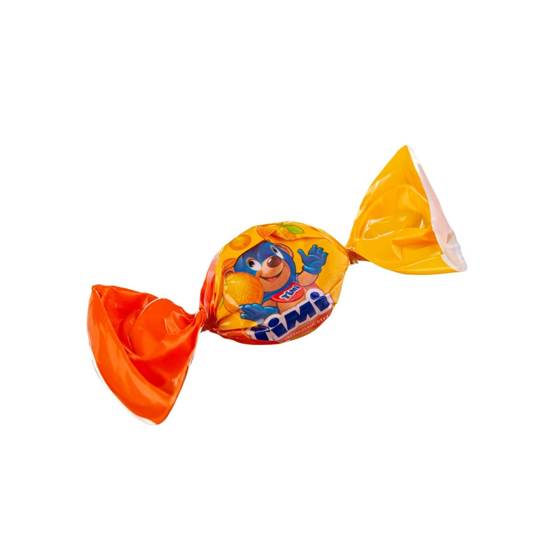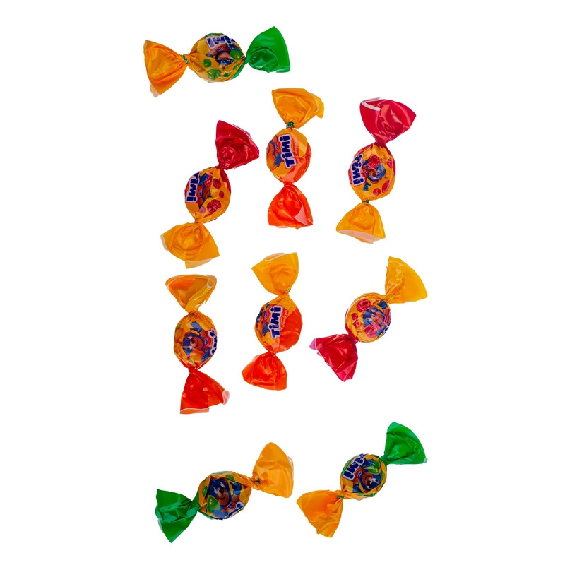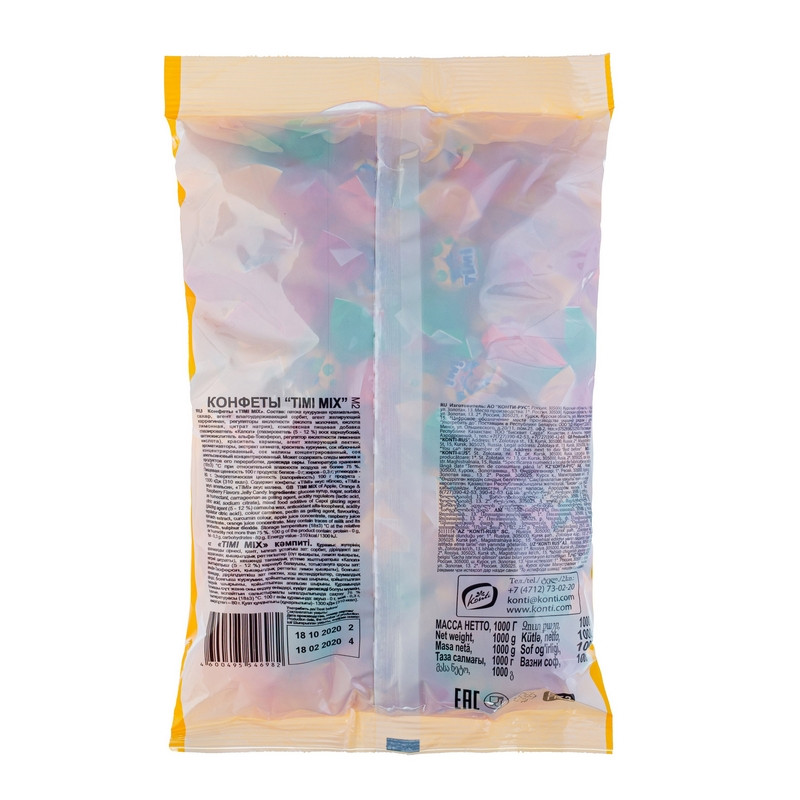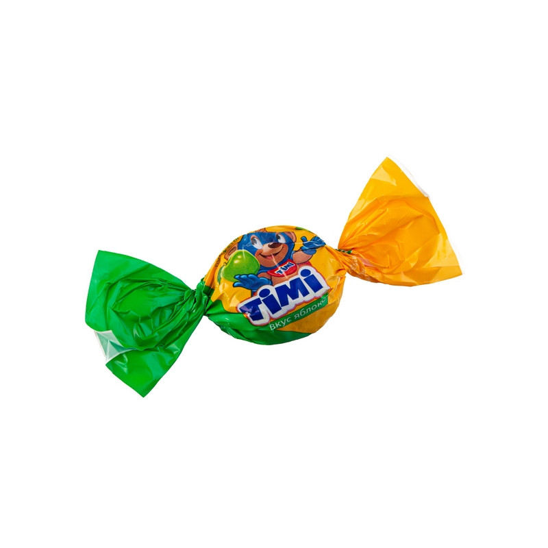 Микс из трех желейных конфет с жидким, сочным центром со вкусами яблока, апельсина и малины. Конфеты 'TIMI MIX'. Состав: патока кукурузная крахмальная, сахар, агент влагоудерживающий сорбит, агент желирующий каррагинан, регуляторы кислотности (кислота молочная, кислота лимонная, цитрат натрия), комплексная пищевая добавка глазирователь 'Капол' (глазирователь (5 -12 %) воск карнаубский, антиокислитель альфа-Токоферол, регулятор кислотности лимонная кислота), краситель кармины, агент желирующий пектин, ароматизаторы, экстракт шпината, краситель куркумин, сок яблочный концентрированный, сок малины концентрированный, сок апельсиновый концентрированный. Может содержать следы молока и продуктов его переработки, диоксида серы. Температура хранения (18+3) °С при относительной влажности воздуха не более 75 %. Пищевая ценность 100 г продукта: белков - 0,0 г; жиров - 0,3 г; углеводов - 80 г. Энергетическая ценность (калорийность) 100 г продукта - 1300 кДж (310 ккал). Содержит конфеты: 'TIMI' вкус яблоко, 'TIMI' вкус апельсин, 'TIMI' вкус малина.