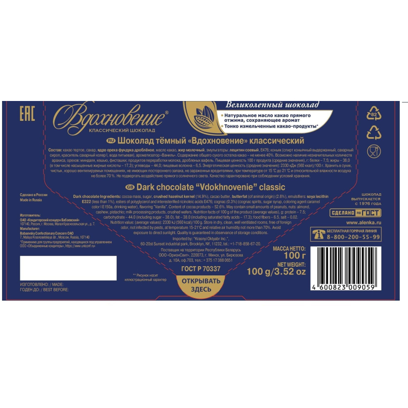 Великолепное лакомство - классический шоколад 'Вдохновение' темный с дробленным фундуком 100 г - изготавливается из первосортных какао-бобов по уникальной рецептуре 1976 года. Достоинства этого лакомства особенно ценят поклонники легкой терпкости в насыщенном традиционном вкусе. Темный шоколад 'Вдохновение' - гармоничное дополнение к горячему чаю любого сорта, какао, кофе. Десерт ненавязчиво подчеркивает благородные оттенки напитков, добавляет уместные сладкие акценты. Стандартная плитка разделена на 10 стиков, завернутых поштучно в фольгу. Такой вариант удобен тем, кто любит растягивать удовольствие, дозированно потребления сладости. Небольшие порции десерта идеальны для угощения друзей, родных, коллег. Мини-плитки плотно уложены в картонную упаковку, которая надежно оберегает их от разломов, упрощает переноску в сумке, кармане. 'Вдохновение' - милый сюрприз близким людям и стильное дополнение к презенту, помогающее выразить чувства благодарности, симпатии, уважения. Наслаждайтесь шоколадом и угощайте окружающих, воодушевляйтесь на добрые поступки и творческие свершения, заряжайтесь энергией и жизнерадостностью от яркого многогранного вкуса 'Вдохновения'. Состав: какао тертое, сахар, какао-масло, ядро ореха фундука дробленое, жир молочный, эмульгатор лецитин соевый, коньяк, ароматизатор 'Ваниль'. Массовая доля общего сухого остатка какао не менее 50,3 % в темном шоколаде. Возможно незначительное количество арахиса, миндаля и кешью, молочных продуктов. Страна производства: Россия. Общая упаковка: картонная коробка. Суммарный вес продукта: 100 г. Срок хранения: 12 месяцев.