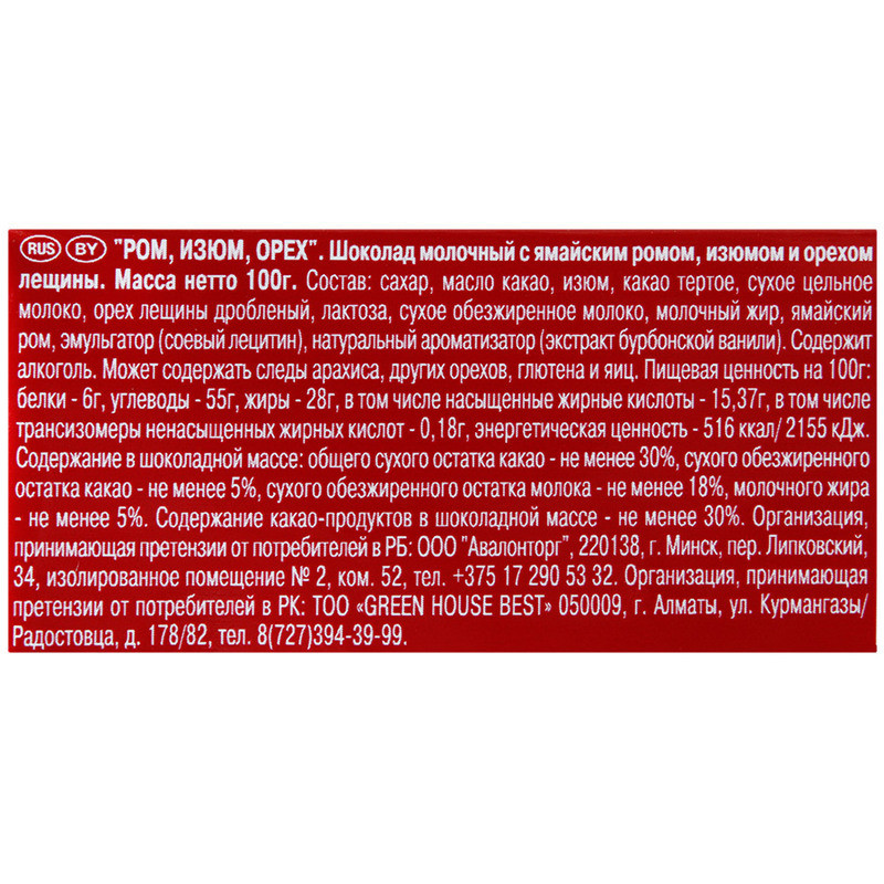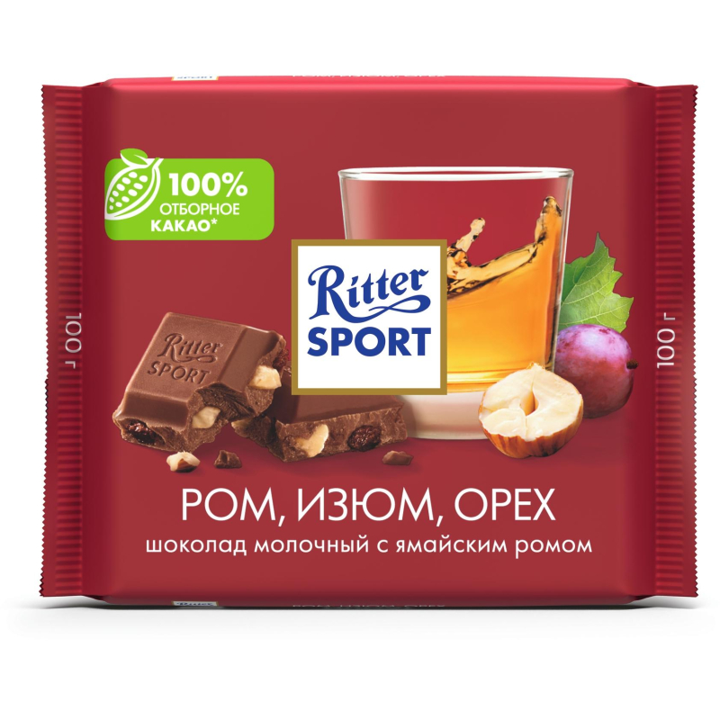 Шоколад Ritter Sport. Вес 100 г. Высококачественный молочный шоколад с ямайским ромом, изюмом обжаренным орехом лещины. Состав: сахар, какао - масло, изюм, какао тертое, сухое цельное молоко, орех лещины дробленый, лактоза, сухое обезжиренное молоко, молочный жир, ямайский ром, эмульгатор (соевый лецитин), натуральный ароматизатор (экстракт бурбонской ванили). Содержание какао-продуктов в шоколадной массе - не менее 30%. Общее содержание в шоколадной массе: сухого остатка какао - не менее 30%, сухого обезжиренного какао - не менее 6%, сухого общего остатка молока - не менее 18%, молочного жира - не менее 6%. Может содержать следы арахиса, других орехов, глютена. Содержит алкоголь. Пищевая ценность в 100 г продукта: белки - 6 г, углеводы - 55 г, жиры - 28 г. Энергетическая ценность в 100 г продукта: 510 ккал. Хранить в сухом прохладном месте при температуре от +15°С до +21°С и относительной влажности не более 65%.