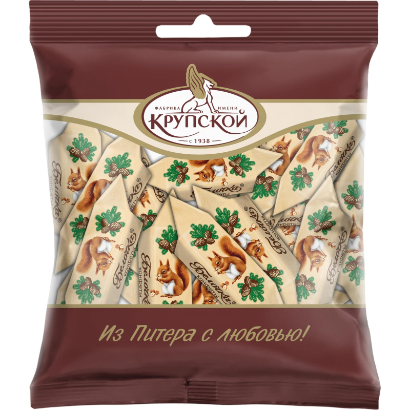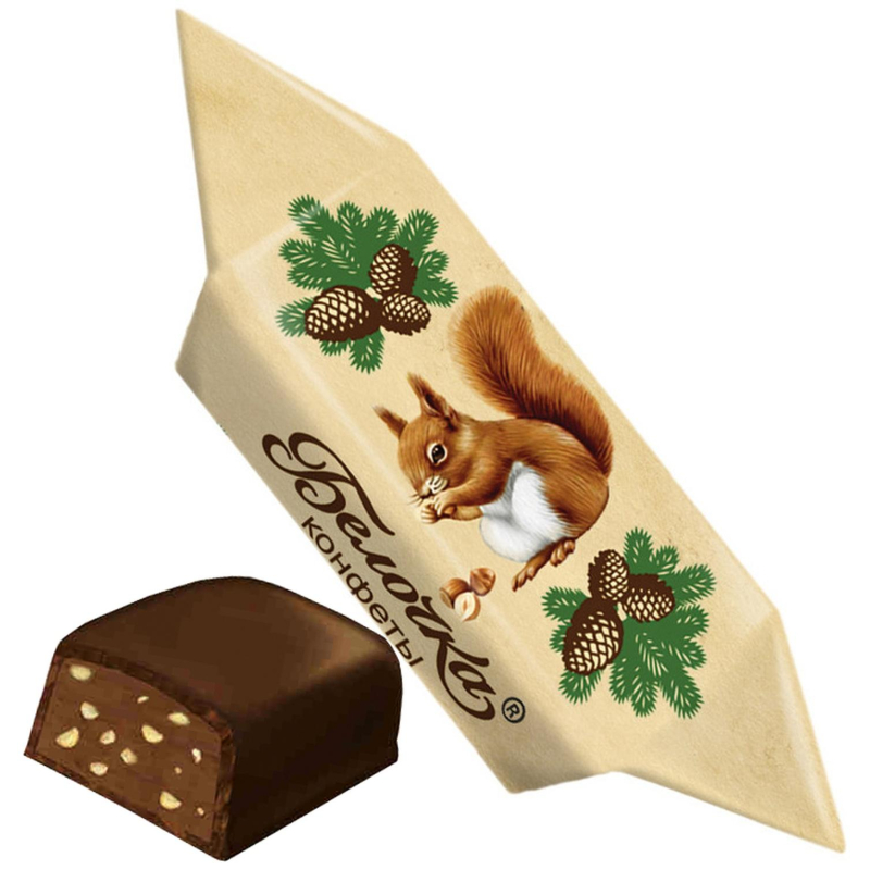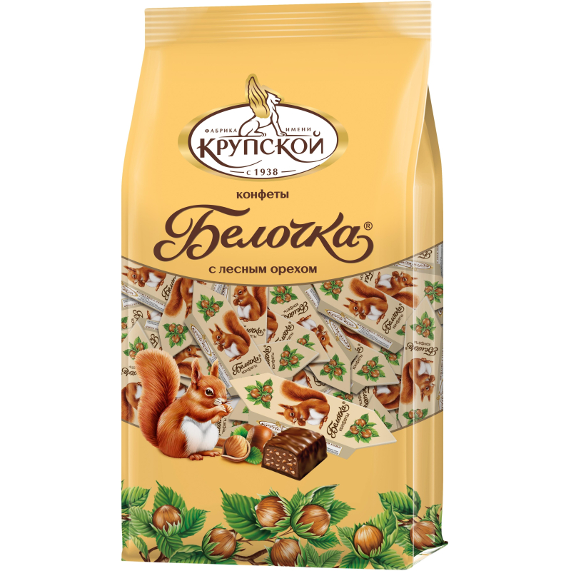 Конфеты Белочка Фабрика им Крупской 200 г Шоколадные конфеты ?Белочка? с восхитительным вкусом шоколада и лесного ореха - отличный десерт к чаю или кофе. Конфеты покрыты шоколадной глазурью, корпус - из нежного пралине. Начинка: орехово-шоколадная масса с дробленым фундуком. Конфеты прямоугольной формы упакованы в полипропиленовый пакет. Вес - 200 г. Состав: сахар, фундук, эквивалент масла какао (масла растительные, эмульгатор Е322), какао-порошок, какао тертое, эмульгаторы (лецитин соевый, Е476), ароматизатор. Может содержать незначительное количество молочных продуктов, пшеничного и соевого белков, арахиса, семян подсолнечника, яйцепродуктов. Пищевая ценность на 100 г продукта: белки - 9 г, жиры - 35 г, углеводы - 51 г. Энергетическая ценность на 100 г продукта: 560 ккал/2330 кДж Срок годности: 9 месяцев. Условия хранения: хранить при температуре от 15°С до 21°С и относительной влажности воздуха не более 75%. Не подвергать воздействию прямого солнечного света. Хранить в помещениях, не зараженных вредителями хлебных запасов. Вес: 200 г. Страна производства: Россия.
