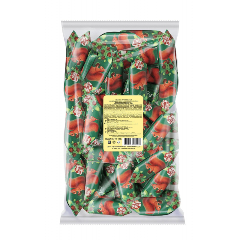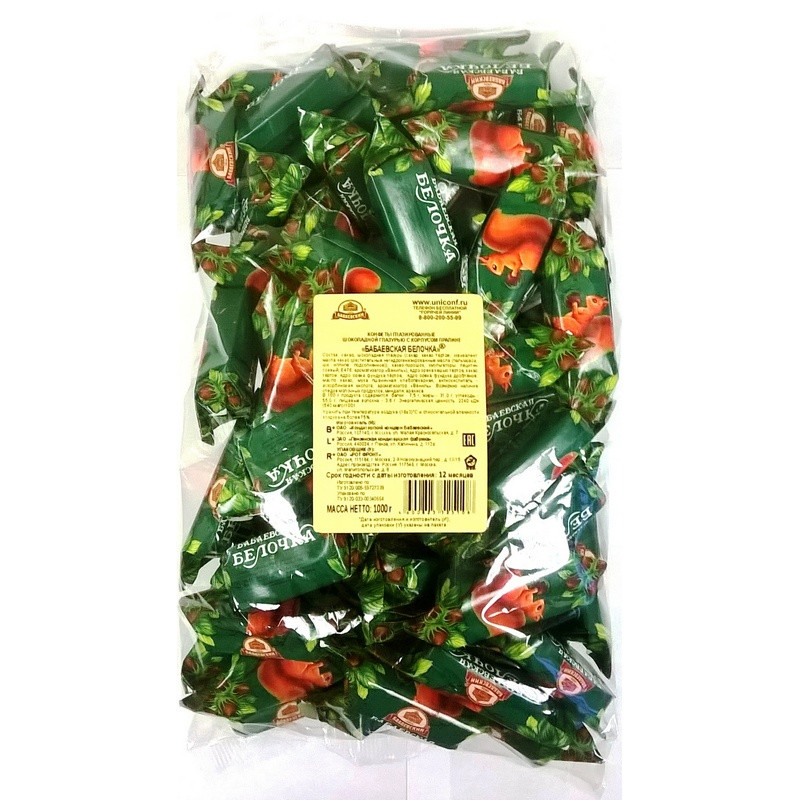 Конфеты шоколадные 'Бабаевская Белочка' 1 кг - это вкуснейшее шоколадно-ореховое пралине с кусочками дробленого фундука в шоколадной глазури. Конфеты, родом из детства, дарят неизменно приятные мгновения и насыщают положительными эмоциями. Легендарные конфеты покорили не одно поколение сладкоежек, и до сих пор находятся среди самых любимых и главных лакомств для домашних чаепитий и праздничных угощений. Шоколадно-ореховый вкус 'Белочки' знаком и взрослым, и детям, которые с удовольствием наслаждаются этими чудесными кондитерскими изделиями. Фабрика 'Бабаевский', где производятся конфеты, является старейшим предприятием России, история которого началась более двух веков назад, в 1804 году. С тех пор она неустанно развивается, повышает качество и расширяет ассортимент продукции, оснащается высокотехнологичным и современным оборудованием. Продукция кондитерской фабрики 'Бабаевский' неоднократно отмечалась на международных конкурсах и выставках, а также завоевала любовь и доверие потребителей. Побалуйте себя изумительным вкусом детства и заряжайтесь энергией на самые главные и важные победы! Состав: сахар, шоколадная глазурь (сахар, какао тертое, эквивалент масла какао (рафинированные, дезодорированные, фракционированные, негидрогенизированны?е растительные масла (пальмовое, ши), какао-порошок, эмульгаторы: лецитин соевый, Е476; ароматизатор 'Ваниль'), ядро ореха кешью тертое, какао тертое, ядро ореха фундука тертое, ядро ореха фундука дробленое, масло какао, мука пшеничная термообработанная, антиокислитель аскорбиновая кислота, ароматизатор 'Ваниль'. Возможно наличие незначительного количества арахиса, миндаля, молочных продуктов. Вес: 1000 г. Тип упаковки: мягкая. Страна производства: Россия. Срок хранения: 9 месяцев. ТУ 9120-005-59727039-1.