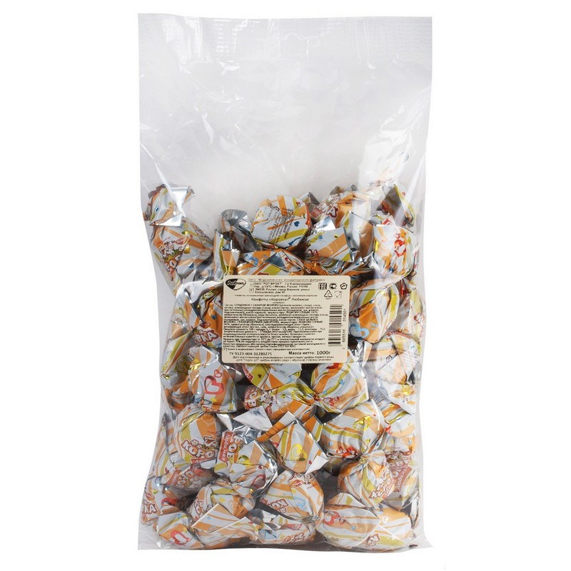 Конфеты 'Коровка Любимая' - новый формат любимой с детства 'Коровки'. Нежная карамельно-сливочная начинка, чуть вязкая и в то же время текучая, покрыта ароматной шоколадной глазурью, которая помогает конфете сохранять ее куполообразную форму. Изысканный белый фантик добавляет конфетам торжественности, делая их прекрасным вариантом для подарка или праздничного угощения. Состав: сгущенное с сахаром молоко (цельно молоко, сахар), сахар, патока, шоколадная глазурь (сахар, какао тертое, эквивалент масла какао (растительные негидрогенизированны?е масла (пальмовое, ши, иллипе, подсолнечное)), какао-порошок, эмульгаторы: лецитин соевый, Е476, ароматизатор Ваниль), вода питьевая, молочная шоколадная глазурь (сахар, эквивалент масла какао (растительные негидрогенизированны?е масла (пальмовое, ши, иллипе, подсолнечное)), какао тертое, сухое цельное молоко, какао-порошок, сухая молочная сыворотка, эмульгаторы: лецитин соевый, Е476, ароматизатор Ваниль), влагоудерживающий агент сорбит, желирующий агент пектин, соль, ароматизатор Вареная сгущенка. Противопоказано при индивидуальной непереносимости белка молока. Возможно незначительное количество арахиса, орехов, яичных продуктов. Пищевая ценность в 100 г продукта: белки - 3 г, жиры - 11 г, углеводы - 75 г. Энергетическая ценность в 100 г продукта: 410 ккал/1730 кДж. Хранить при температуре от +15°С до +21°С и относительной влажности воздуха не более 75 %. Не подвергать воздействию прямого солнечного света. Производитель: ОАО 'ВКФ'. Страна производства: Россия.