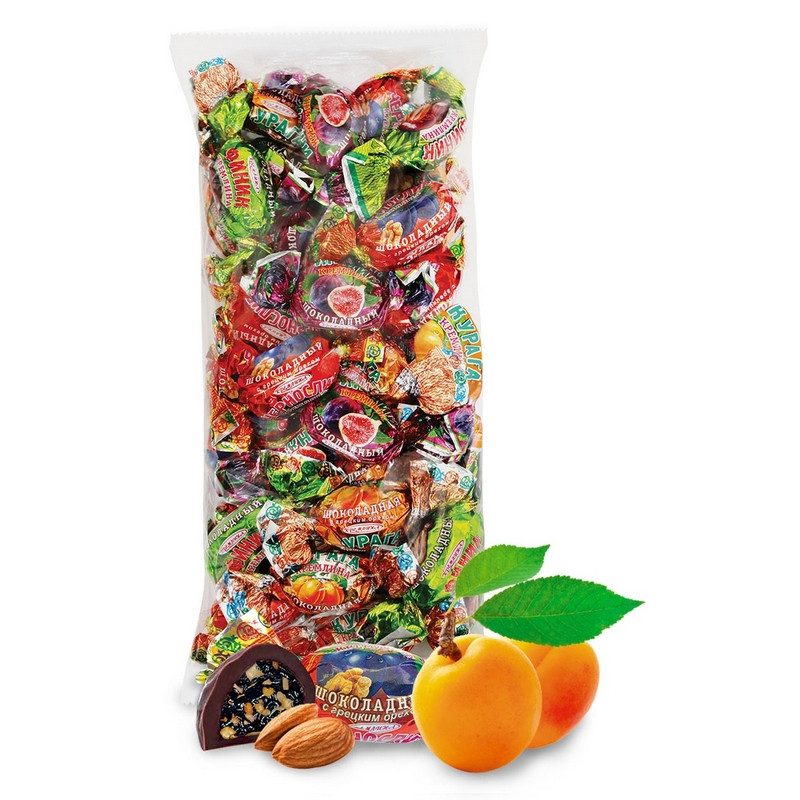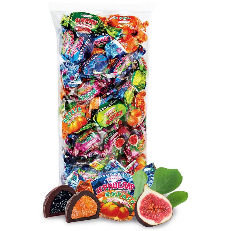 Набор из сухофруктов в шоколадной глазури.Аппетитные Чернослив, Курага, Финик и Инжир с орехами высочайшего качества из самых теплых стран мира. Богатый ассортимент в одной упаковке. Конфеты в шоколадной глазури: чернослив с грецким орехом, курага с грецким орехом, финик, инжир. Состав: слива сушеная (чернослив), абрикос сушеный (курага), глазурь кондитерская (сахар-песок, заменитель масла какао, какао порошок, эмульгатор - лецитин соевый, ароматизатор, идентичный натуральному Ванилин), фруктовый наполнитель (пюре сливовое, плодово-ягодное пюре, пюре абрикосовое, сахар, загуститель Е 1422, консервант - сорбиновая кислота), сахар, патока крахмальная. Пищевая ценность в 100 г продукта: Белки - 2,7 г, жиры - 16 г, углеводы 58 г. Энергетическая ценность в 100 г продукта: 381 ккал. Хранить при температуре от +15°C до +21°C в сухом прохладном месте, не допускать замерзания.