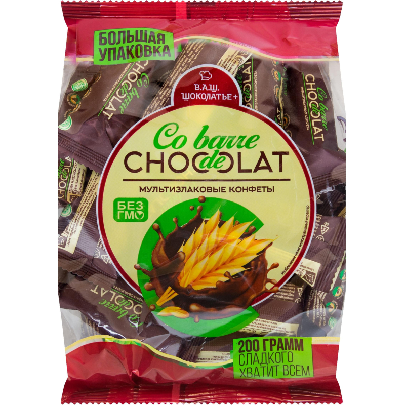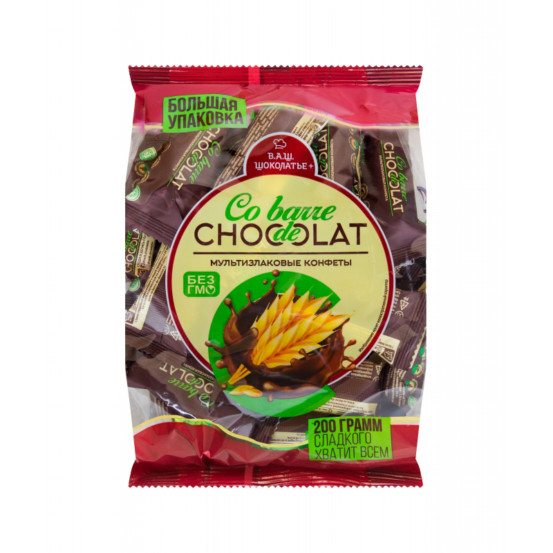 Удивительно вкусное и полезное лакомство, сочетающее в себе пользу злаковых культур с богатым вкусом темной глазури. Мультизлаковые конфеты 'Co barre de Chocolat' с темной глазурью станут прекрасным дополнением к чаепитию и желанным угощением на любом столе! Попробуйте новый формат полезного наслаждения! Состав: крупа (пшеничная, кукурузная, овсяная), патока, мальтоза, кондитерская глазурь: сахар, заменитель масла какао нетемперируемый лауринового типа (масло пальмоядровое (стеарин) гидрогенизированное рафинированное дезодорированное, эмульгатор сорбитан тристеарат), какао- порошок, эмульгаторы: лецитин соевый, полиглицерин полирицинолеат, ароматизатор Ванилин). Продукт может содержать следы орехов, молочных продуктов. Вес: 200 г. Пищевая ценность в 100 г продукта: белки - 7,0 г, жиры - 16,4 г, углеводы - 70,9 г. Энергетическая ценность: 459 ккал (1921,74 кДж). Срок годности: 12 месяцев. Хранить при температуре (18,0 + 5,0)°С и относительной влажности воздуха не выше 75%. Производитель: ООО В.А.Ш. Шоколатье+ Страна производства: Россия.