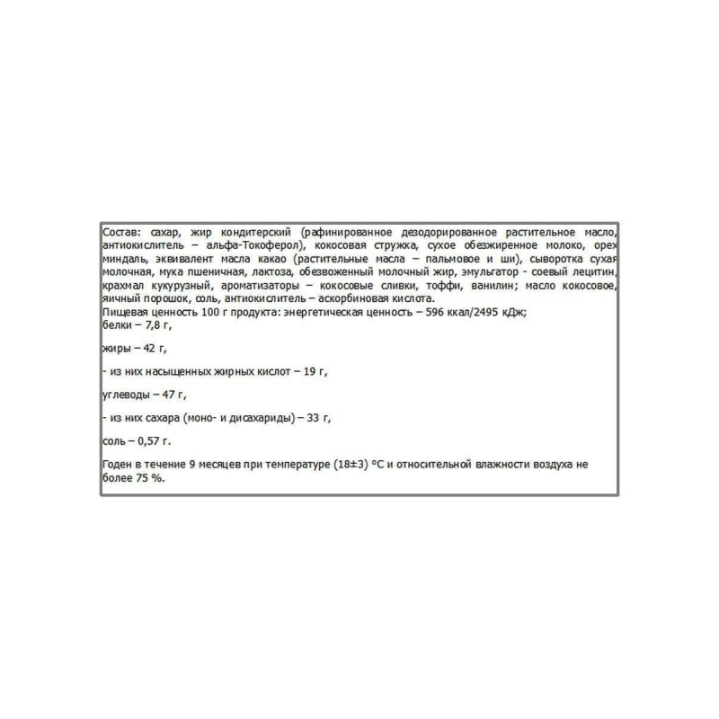 Конфеты в вафельном корпусе с обсыпкой кокосовой стружкой в белой глазури на основе кремовой начинки с вложением цельного ореха миндаля. Состав крахмал кукурузный, сахар, жир кондитерский, кокосовая стружка, сыворотка, миндаль, молоко сухое обезжиренное, мука пшеничная, какао масла заменитель.
