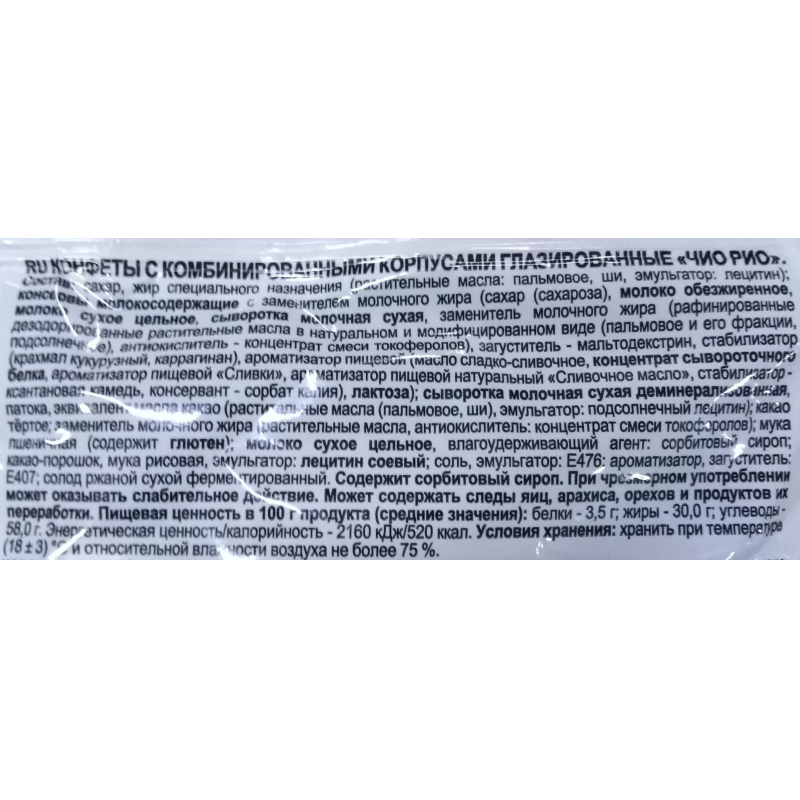 Конфеты Яшкино "Чио Рио" из нежного пралине с хрустящими бисквитными шариками, покрытыми мягкой карамелью и глазурью. Состав: сахар, жир специального назначения (растительные масла: пальмовое, ши, эмульгатор: лецитин); консервы молокосодержащие с заменителем молочного жира (сахар (сахароза), молоко обезжиренное, молоко сухое цельное, сыворотка молочная сухая, заменитель молочного жира (рафинированные дезодорированные растительные масла в натуральном и модифицированном виде (пальмовое и его фракции, подсолнечное), антиокислитель - концентрат смеси токоферолов), загуститель - мальтодекстрин, стабилизатор (крахмал кукурузный, каррагинан), ароматизатор пищевой (масло сладко-сливочное, концентрат сывороточного белка, ароматизатор пищевой "Сливки", ароматизатор пищевой натуральный "Сливочное масло", стабилизатор - ксантановая камедь, консервант - сорбат калия), лактоза); сыворотка молочная сухая деминерализованная, патока, эквивалент масла какао (растительные масла (пальмовое, ши), эмульгатор: подсолнечный лецитин); какао тертое; заменитель молочного жира (растительные масла, антиокислитель: концентрат смеси токоферолов); мука пшеничная (содержит глютен); молоко сухое цельное, влагоудерживающий агент: сорбитовый сироп; какао-порошок, мука рисовая, эмульгатор: лецитин соевый; соль, эмульгатор: Е476; ароматизатор, загуститель: Е407; солод ржаной сухой ферментированный. Хранить при температуре (18+3) °С и относительной влажности воздуха не более 75%.