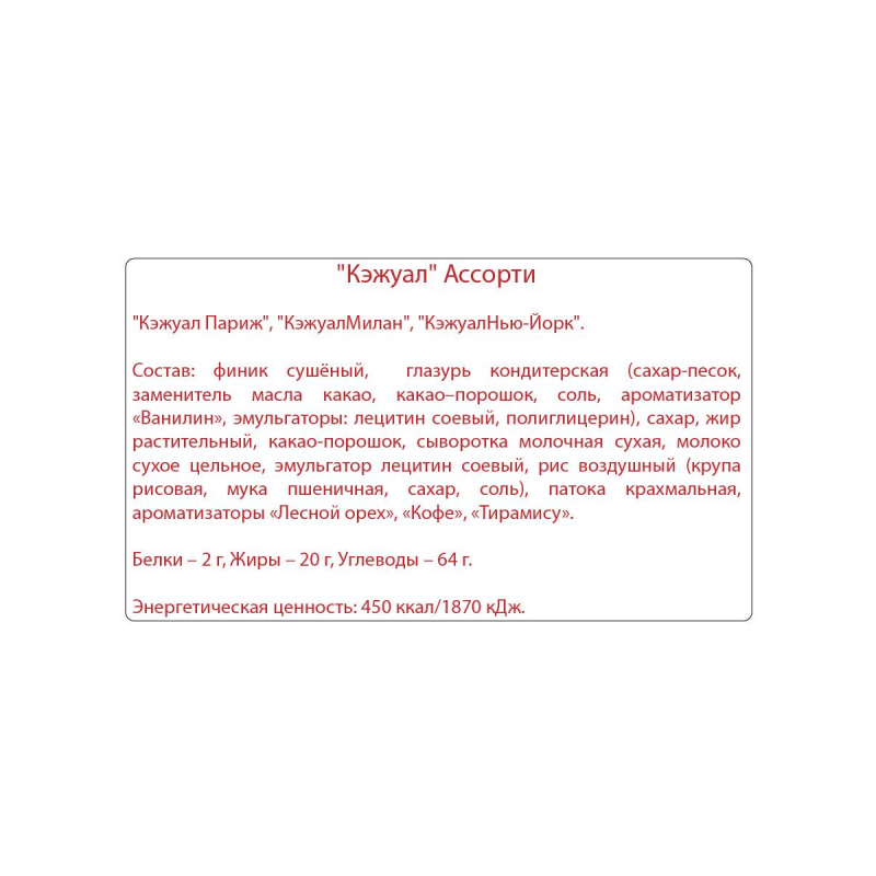 Конфеты шоколадные Кремлина 'Casual' ассорти 1 кг - великолепные конфеты с прекрасными названиями известных столиц - Милан и Париж. Вкуснейшая начинка на основе натурального финика с воздушным рисом в одном варианте, кремовая с воздушным рисом в другом, и толстый слой шоколадной глазури подарят незабываемое удовольствие и наслаждение всем поклонникам шоколадных десертов. Прекрасный дуэт конфет Кремлина 'Casual' украсит домашние и офисные чаепития, порадует гостей и поможет создать праздничную атмосферу в обычный день. Сладкое лакомство подарит заряд энергии и отличное настроение, а также вдохновит на достижение поставленных целей и активизирует работу головного мозга. Это отличный вариант для угощения коллег, друзей, родных и близких, которые непременно оценят ваш вкус и заботу. Ассорти шоколадных конфет станет удачным выбором для наполнения подарочных корзин, в качестве сопровождения чая и вина, а также для самостоятельного создания новогодних подарков для детей. Килограммовая упаковка - это много ярких и вкусных мгновений и не одна порция сладкого чаепития. Состав: финик сушеный, глазурь кондитерская, крошка карамельная, рис воздушный, начинка кремовая на жировой основе, патока крахмальная, ароматизаторы 'Лесной орех', 'Ванильные сливки'. Натуральный продукт. Без ГМО, без искусственных красителей. Не содержит пальмовое масло. Вес: 1000 грамм Тип упаковки: картонная коробка Страна производства: Россия Срок хранения: 10 месяцев