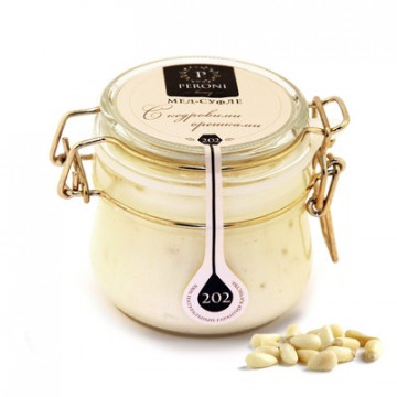 Мед-суфле ?Кедровый орех?, изготовленный с использованием уникального набора медоносных растений средней полосы России. Мед-суфле готовится по особой технологии: замешивается при температуре 12-14 градусов по Цельсию, не допуская при этом воздействия открытого воздуха. Таким образом, мед сохраняет все полезные свойства, не засахаривается, приобретает более светлый оттенок и структуру нежного суфле. Мед нежного сливочного цвета имеет приятный вкус с тонкими нотами ядер кедровых орехов. Мед с кедровым орехом - это целый питательный комплекс с непревзойденным вкусом. Нежный и яркий вкус кедрового орешка подчеркивается тонким ароматом меда. Состав: мед натуральный цветочный, ядра кедрового ореха. Пищевая ценность на 100 г: углеводы - 75 г, белки - 2.5 г, жиры - 5.5 г, энергетическая ценность 360 ккал. Срок и условия хранения: 12 месяцев при t не выше 20 градусов Цельсия при влажности не более 75%. Поставляется в стеклянной баночке с бугельным замком. Размер банки: 8.5x11x9 см. Страна производства - Россия.