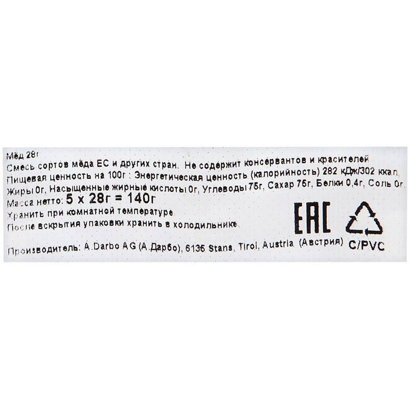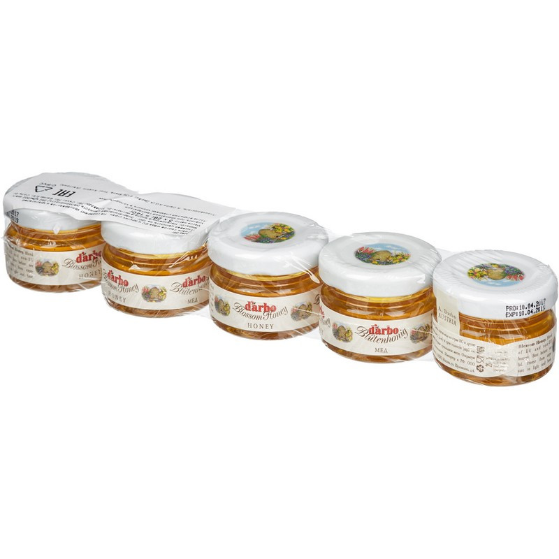 Мед порционный Darbo 28 г (5 штук в упаковке). Польза цветочного меда официально подтверждена научными исследованиями: доказано, что он является великолепным средством при лечении простудных заболеваний и бессонницы. Этот вид меда способен быстро восстанавливать силы, поэтому он полезен людям, перенесшим сложные заболевания. Его успокоительные свойства используются при лечении психических расстройств. Также мед советуют употреблять в пищу при заболеваниях пищеварительной и дыхательной систем, сердечно-сосудистой недостаточности и анемии. Натуральный цветочный мед янтарного цвета. Без красителей и консервантов, сохраняет полезные свойства в течение долгого времени. Подходит для поездок благодаря удобной банке с закручивающейся крышкой. Пищевая ценность на 100 г продукта: белки - 0,4 г, углеводы - 75 г. Энергетическая ценность на 100 г продукта: 302 ккал/1282 кДж. Тип упаковки: стеклянная банка. Условия хранения: при температуре от 15 до 25 °C в сухом прохладном месте. После вскрытия хранить в холодильнике при температуре от 2 до 5 °С. Производитель: Adolf Darbo A.G. Страна производства: Австрия.
