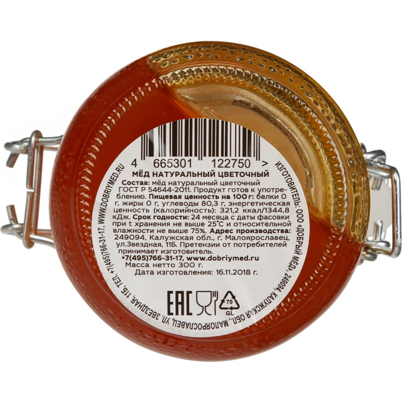 Цветочный мед - это натуральный продукт, который способен нормализовать работу органов и систем человека. Натуральный мед, собранный пчелами, является источником самых разных витаминов и микроэлементов. Он является естественным антиоксидантом, помогает улучшить кровообращение, ускоряет липидный обмен. Консистенция продукта средняя - он не слишком густой, но и не редкий. В процессе кристаллизации сахарится, становится гуще, однако не теряет целебных свойств. Состав: натуральный цветочный мед. Пищевая ценность: углеводы - 80.3 г, калорийность - 321.2 ккал. Поставляется в стеклянной баночке с бугельным замком. Размер банки: 8.5x8.3x8.2 см. Срок и условия хранения: 24 месяца при t не выше 20 °С. Страна производства - Россия. Возможна кристаллизация меда!