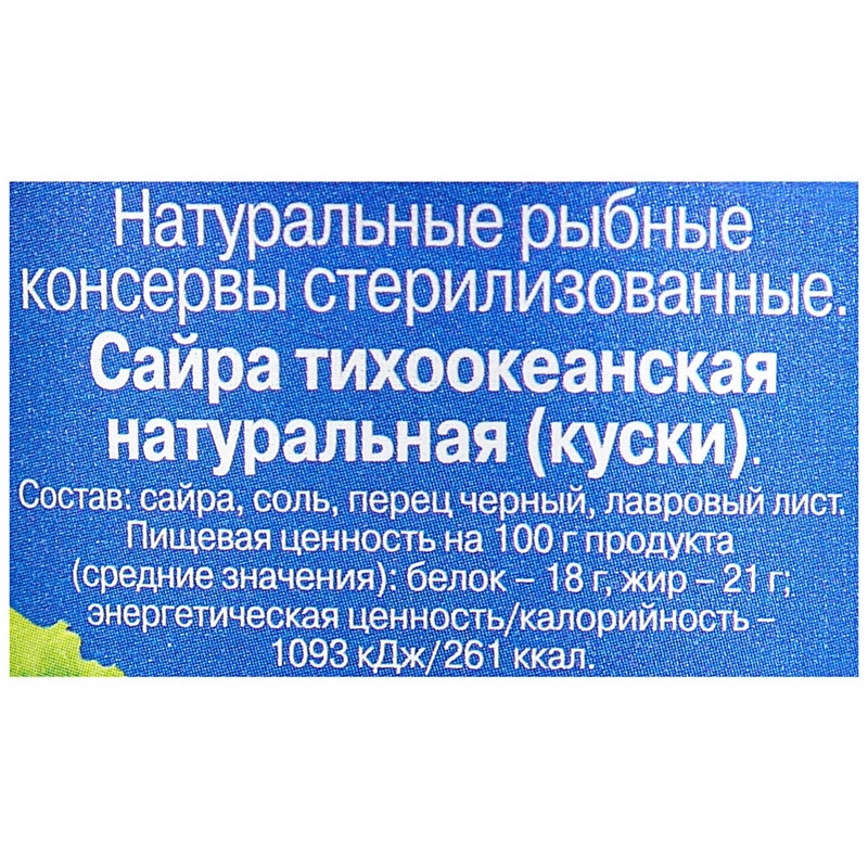 Сайра 5 морей "Тихоокеанская натуральная" 250 г. Состав: сайра, соль, перец черный, лавровый лист. Пищевая ценность на 100 г: белки - 18 г, жиры - 21 г. Энергетическая ценность: 261 ккал. Хранить при температуре от 5 до +25°C и относительной влажности воздуха не более 75%. Страна производства: Россия.