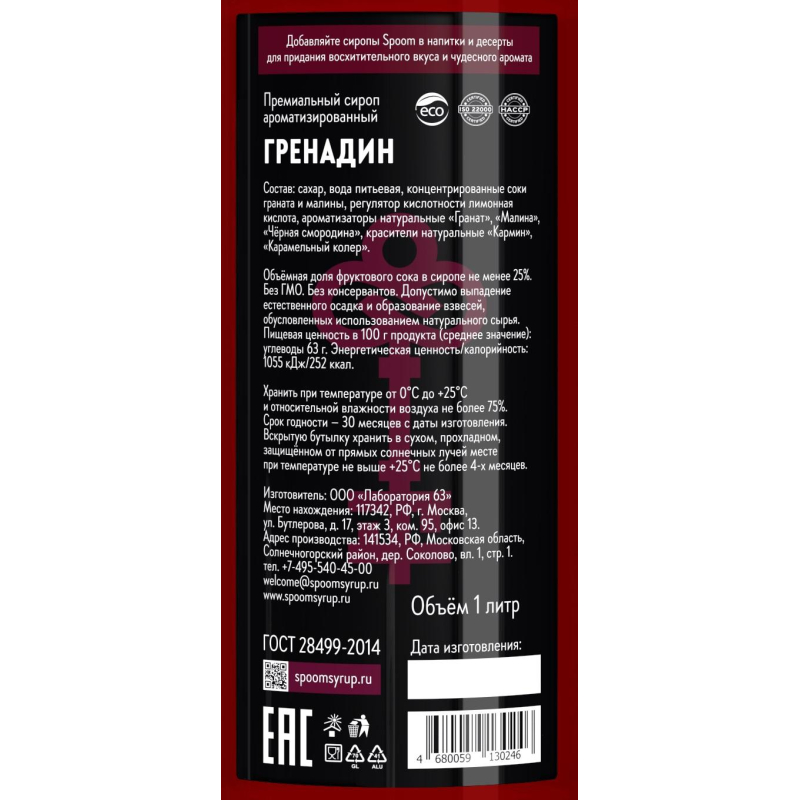 Сироп Spoom 'Гренадин' представляет собой гармоничное сочетание граната и малины. Сироп по праву можно назвать самым популярным и универсальным вкусом в многогранном барном искусстве. Благодаря своему яркому кисло-сладкому вкусу и насущенному красному цвету его используют по всему миру для приготовления самых известных коктейлей. Может применяться для алкогольных и безалкогольных напитков, а также служить дополнением для десертов и мороженого. Без ГМО. Без консервантов. Spoom - первый российский производитель сиропов, стандарты и технологии которого отвечают самым строгим европейским нормам. Продукция Spoom по ароматике и плотности соответствует стандартам премиального уровня. Состав: сахар, вода питьевая, концентрированный гранатовый сок, концентрированный малиновый сок, регулятор кислотности лимонная кислота, ароматизаторы натуральные Гранат, Малина, Черная смородина, красители натуральные Кармин, Карамельный колер. Объемная доля фруктового сока в сиропе не менее 25%. Пищевая ценность на 100 г продукта: углеводы - 63 г. Энергетическая ценность на 100 г продукта: 1055 кДж/252 ккал. Условия хранения: хранить при температуре от 0 до +25°С и относительной влажности воздуха не более 75%. Вскрытую бутылку хранить в сухом, прохладном, защищенном от прямых солнечных лучей месте при температуре не выше +25°С не более 4-х месяцев. Срок годности: 30 месяцев с даты изготовления. Вес: 1 кг. Страна производства: Россия.