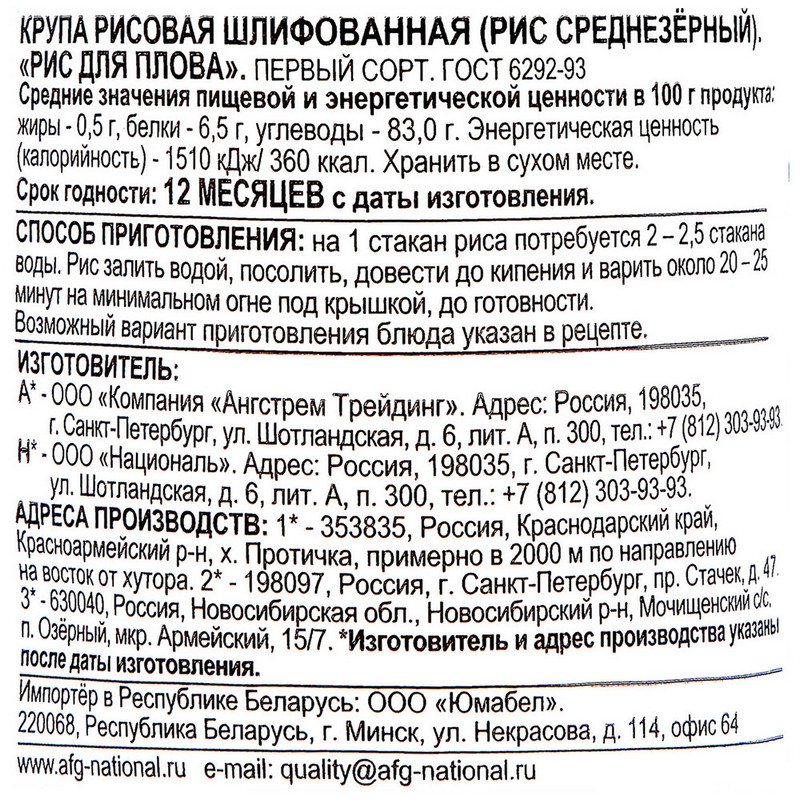 Рис "Националь" для плова 900 г - это среднезерный сорт риса, предназначенный для приготовления традиционного узбекского плова. Полупрозрачные крупные зернышки отлично впитывают все ароматы и даже после термической обработки сохраняют свою форму, а блюда, приготовленные из него, получаются рассыпчатыми и вкусными. Современные шелушильные машины бережно очищают зерна, не повреждая ядро и делая поверхность гладкой и блестящей. Такой рис обладает высокой питательной ценностью и может стать хорошей углеводной основой питания всей семьи. Пищевая ценность в 100 г: белки - 6.5 г, жиры - 0,5 г, углеводы - 83 г. Энергетическая ценность (калорийность) в 100 г: 1510 кДж/360 ккал. Условия и срок хранения: хранить в сухом месте. Производитель: "Ангстрем Трейдинг".