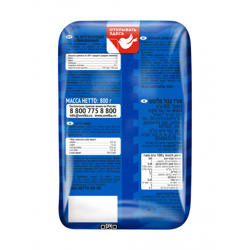 Рис Увелка круглозерный 800 г.В состав риса входят 8 важнейших аминокислот, необходимые для создания новых клеток, а также поддерживающих мышечную силу. Рис часто используют в диетах, т.к. почти не содержит жира, при этом крахмал в рисе быстро обвалакивает желудок и изгоняет голод. Рис содержит лицетин, известный активатор мозговой деятельности, олигосахарид, востанавливающий кишечник.Состав: рис круглозерный шлифованный.Пищевая ценность: белки - 8 г, жиры - 1 г, углеводы - 76 г.Энергетическая ценность: 350 ккал.Способ приготовления: в кипящую воду засыпьте рис в соотношении 2:1. Добавьте соль и сахар по вкусу. Варите на слабом огне 20-25 минут.Хранить в сухом, хорошо вентилируемом не зараженном вредителями хлебных запасов помещении при температуре не более 20°C и относительной влажности воздуха не более 75%.Страна производства: Россия.