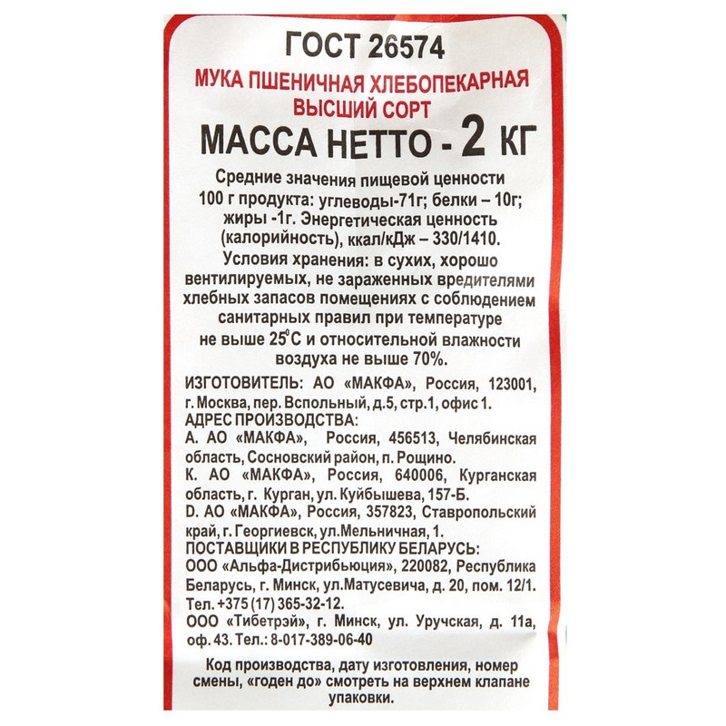 Мука высшего сорта - самая нежная и воздушная. Она подходит практически для всех видов мучных изделий: хлеба, булочек, кексов, бисквитов, изготовления теста для пиццы, пирогов и пирожков, пельменей и вареников. Ее можно использовать и как загуститель для соусов. Из муки Макфа получается отличная выпечка. Пищевая ценность в 100 г: белки - 10 г, углеводы - 71 г, жиры - 1 г. Энергетическая ценность в 100 г: 330 кКал. Условия хранения: хранить в сухих, хорошо вентилируемых, не зараженных вредителями хлебных запасов, помещениях с соблюдением санитарных правил при температуре не выше 25 градусов по Цельсию и относительной влажности воздуха не выше 70%.