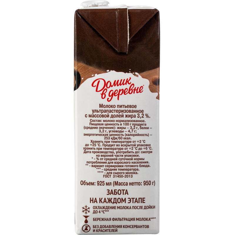Дизайн упаковки может отличаться от фотографии, что не влияет на качество и вкус продукта. Молоко питьевое ультрапастеризованное, с массовой долей жирности 3,2%, вес 925 мл. Идеально подходит для капучино. Состав: молоко обезжиренное, молоко цельное. Пищевая ценность на 100 г: углеводы: 4.7 г, жиры - 3.2 г, белки - 3.2 г. Энергетическая ценность на 100 г: 60 ккал. Хранить при температуре от +2С до +25С. Обменяем товар, если он не подошел вам по остаточному сроку годности