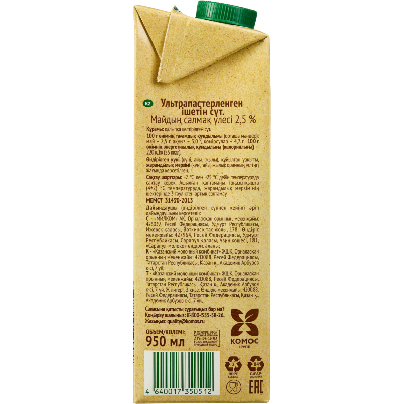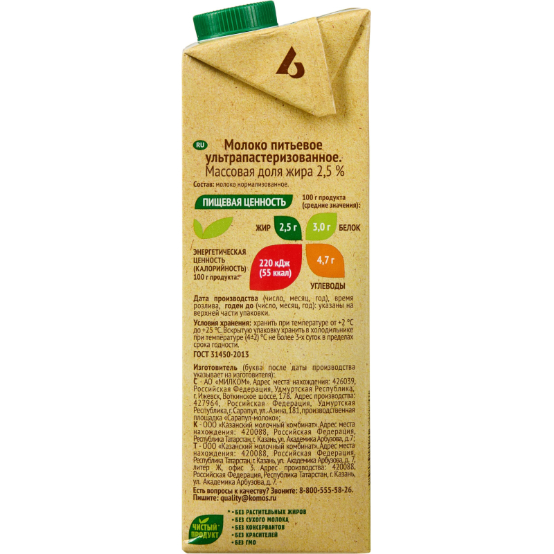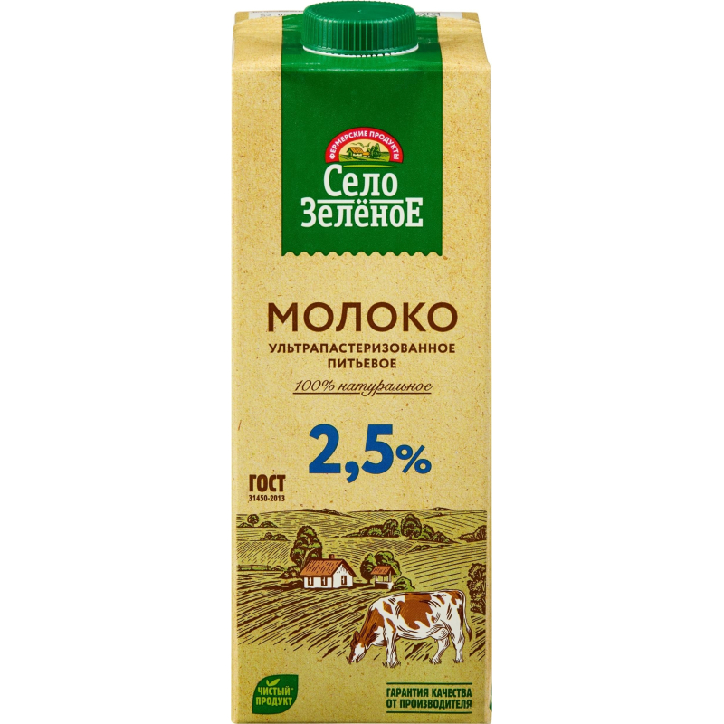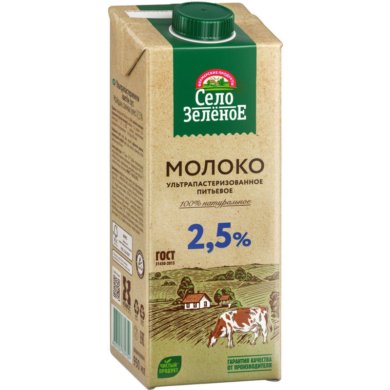 Дизайн упаковки может отличаться от фотографии, что не влияет на качество и вкус продукта. Молоко Село зеленое ультрапастеризованное 2.5% 950 г. - полезный для здоровья натуральный и экологичный продукт высшего качества. Далеко-далеко там, где воздух наполнен свежестью утренней росы и родниковая вода несет приятную прохладу, есть дивное место под названием ?Село Зеленое?. Место это издавна славится своим полезным молоком. Его дают коровы, которые пасутся на бескрайних зеленых лугах и нежатся под ласковым солнцем. За каждой коровой в ?Селе Зеленом? ухаживают с особой заботой, ведь только так можно получить по-настоящему вкусное молоко! Молоко включает в свой состав необходимые нам белки, жиры и углеводы и представляет наиболее ценный источник питательных нутриентов организма. Оно содержит незаменимые в нашем ежедневном рационе элементы такие как кальций, фосфор, калий, а также витамины А, В, D и др. Вырабатывается методом ультравысокотемпературной обработки, позволяющим увеличить срок его хранения и сохранить все полезные пищевые свойства молока. Готовый продукт разливают по картонным коробкам с удобными крышками. Асептическая упаковка создает надежную защиту от света, кислорода и бактерий. Состав: молоко цельное, молоко обезжиренное. Вес/объем: 950 г. Жирность: 2.5% Штук в упаковке: 12 штук Тип упаковки: картонная коробка Пищевая ценность на 100 г.: жир 2.5г, белок 2.8г., углеводы 4.7г. Энергетическая ценность, 100 г.: 53 ккал. Условия хранения: при отсутствии прямого солнечного света при температуре от +2 до +25°С. После вскрытия упаковки хранить в холодильнике. Страна производства: Россия Обменяем товар, если он не подошел вам по остаточному сроку годности