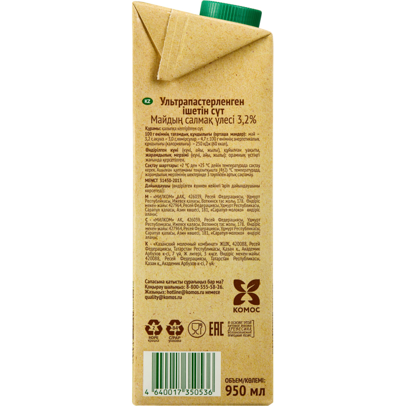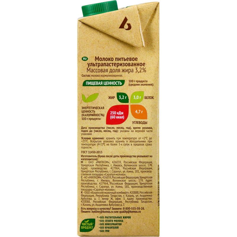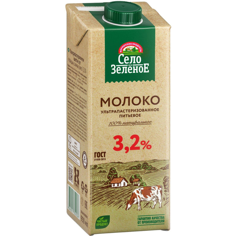 Дизайн упаковки может отличаться от фотографии, что не влияет на качество и вкус продукта. Молоко Село Зеленое питьевое ультрапастеризованное 3.2% 0.95 л. Молоко - ценный пищевой продукт. В состав молока входит большое количество кальция и фосфора, которое благоприятно сказываются на состоянии костей, зубов и ногтей. Кроме этого, фосфор принимает активное участие в синтезе белка. Доказано, что при регулярном потреблении молока улучшается деятельность нервной системы. Состав: молоко цельное, молоко обезжиренное. Хранить при отсутствии прямого солнечного света при температуре от +2 до +25°С. Вскрытую упаковку хранить в холодильнике не более 3-х суток. Объем: 950 мл. Срок годности 7 месяцев. Обменяем товар, если он не подошел вам по остаточному сроку годности