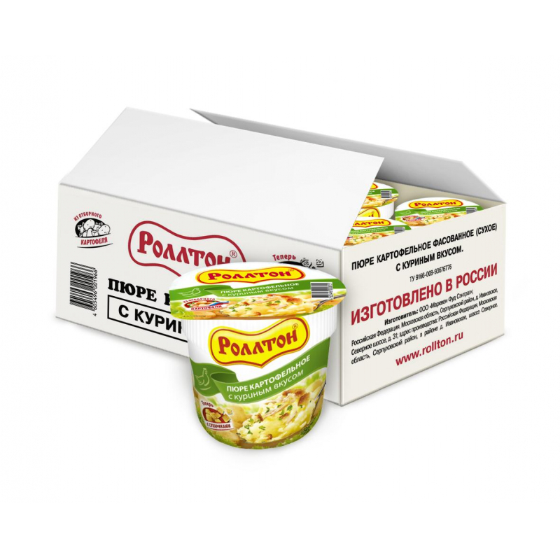 Картофельное пюре Роллтон куриное 24 шт x 40 г Пюре Роллтон создано из самых высококачественных ингредиентов в соответствии с лучшими традициями и вкусовыми предпочтениями потребителей. Аппетитное пюре в стаканчике готовится за 5 минут. Невероятно быстро, при этом сытно и полезно. А яркий куриный вкус нашего пюре зарядит Вас энергией и хорошим настроением на весь денью. Способ приготовления: Откройте крышку и залейте кипяток до ободка. Перемешайте и закройте крышкой. Дайте настояться 5 минут и перемешайте. Пюре готово! Приятного аппетита! Состав товара: Хлопья картофельные (картофель (99%), эмульгатор (Е471), стабилизаторы (Е450i, Е450iii), антиокислители (аскорбиновая и лимонная кислоты, Е223, Е304i), краситель (куркумин)), заменитель сухих сливок на растительной основе (глюкозный сироп, масло растительное, молочный белок, стабилизаторы (Е340, Е452), эмульгаторы (Е471, Е481), агент антислеживающий (Е551)), соль, сушеные овощи и зелень (лук репчатый жареный (лук, масло растительное, мука пшеничная в/с, соль), петрушка), гренки пшеничные (мука пшеничная в/с, масло растительное, соль, дрожжи, антиокислитель (экстракт розмарина), консервант (Е282)), усилители вкуса и аромата (Е621, Е635), сахар, ароматизатор, сухое обезжиренное молоко, куркума. Меры предосторожности: Продукт может содержать незначительное количество продуктов переработки яиц. Пищевая ценность на 100 г продукта: белки - 8.5 г, жиры - 11 г, углеводы - 68 г. Энергетическая ценность на 100 г продукта: 410 ккал. Срок годности: 1 год. Условия хранения: при температуре не более 30 °C и относительной влажности воздуха не более 75%. Вес: 40 г. Тип упаковки: Пластиковая. Страна производства: Россия.