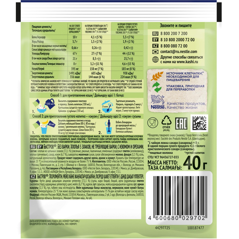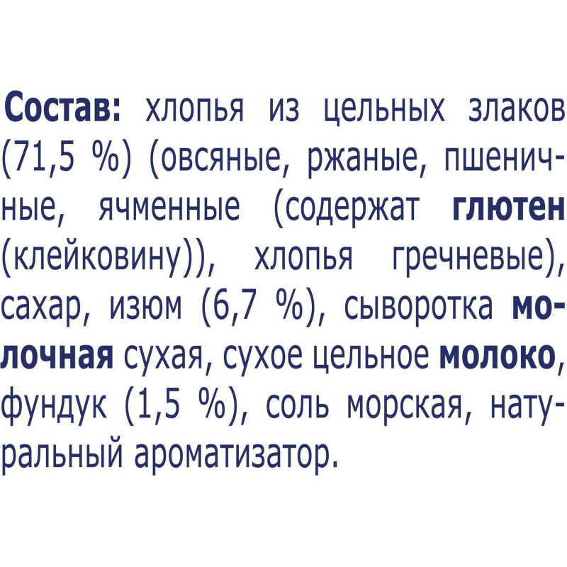 Начни утро с полезных каш Быстров! Мы создали каши Быстров только из натуральных ингредиентов. Овсянка Быстров содержит цельные злаки, в которых сохранены все полезные компоненты овсяного зерна, а значит максимум полезных свойств. Каждая порция каши является источником пищевых волокон (клетчатки), необходимых для пищеварения. Хлопья в каше быстрого приготовления такие же полезные, как и варимые, но они тоньше поэтому для приготовления их достаточно залить кипятком. В составе золотистый изюм 'Султана' и отборный фундук. Фермеры сушат виноград под палящим солнцем, затем очищают его от веточек и листвы и бережно досушивают в печи по специальной технологии, позволяющей сохранить максимально нежную и мягкую текстуру изюма. Наши каши созданы с заботой о планете. Фабрика каш Быстров работает на 'зеленой' электроэнергии ветрогенераторов. Коробки каш Быстров изготовлены из переработанного картона, что позволяет сохранять не менее 5000 тысяч деревьев за год. Мы ответственно обращаемся с отходами производства, они не отправляются на захоронение, а обрабатываются, обезвреживаются и утилизируются. Каша овсяная Быстров - начни утро с пользы! Рекомендации по приготовлению: высыпать содержимое пакета в посуду и залить кипятком (150 мл). Тщательно перемешать и дать настояться в течение 5 минут. Состав: хлопья из цельных злаков (71,5%) (овсяные, ржаные, пшеничные, ячменные (содержат глютен (клейковину)), хлопья гречневые), сахар, изюм (6,7%), сыворотка молочная сухая, сухое цельное молоко, фундук (1,5%), соль морская, натуральный ароматизатор. Продукт может содержать другие орехи, арахис и кунжут. Условия хранения: хранить при температуре не выше 25 °С и относительной влажности воздуха не более 75%. Пищевая ценность на 100 г продукта: белки - 7,8 г, жиры - 8,9 г, углеводы - 60,4 г. Энергетическая ценность: 377 ккал.