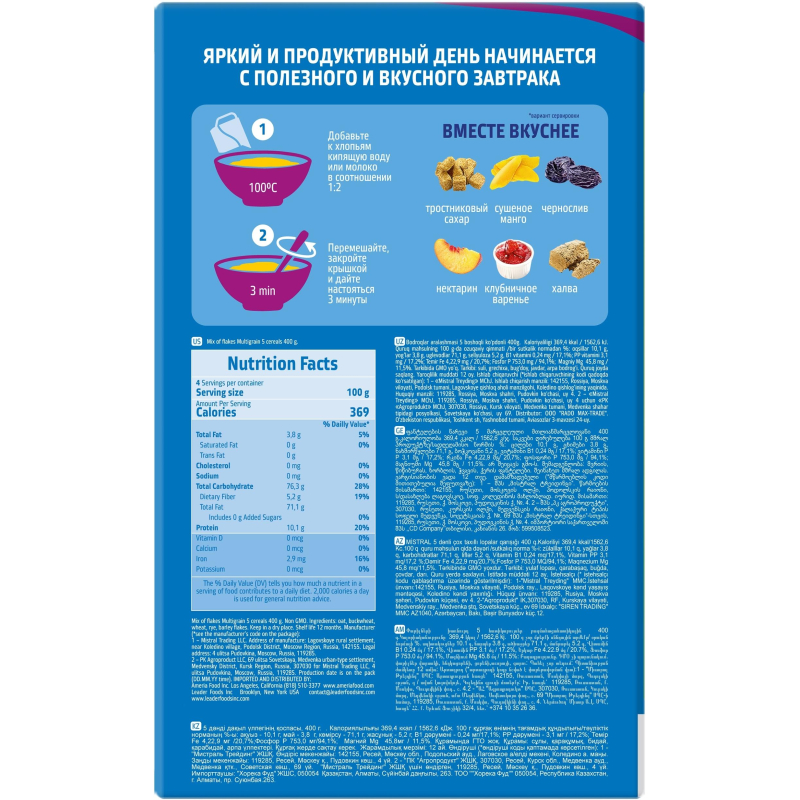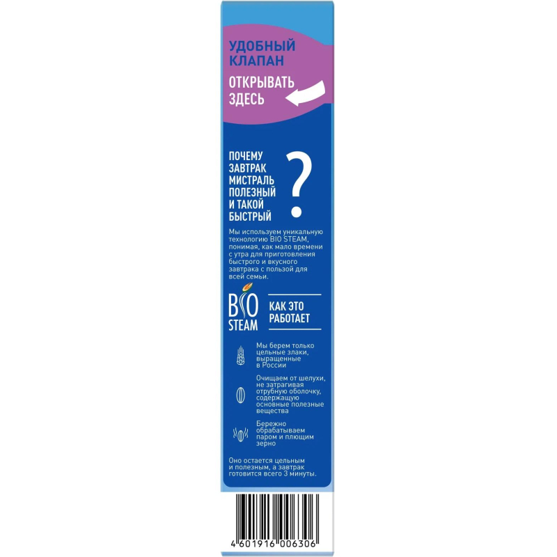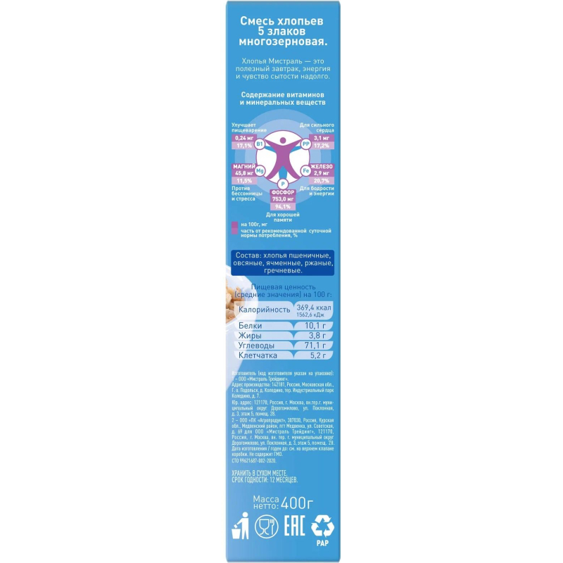 Состав: Хлопья Овсяные Гречневые, Пшеничные, Ржаные, Ячменные. Пищевая ценность в 100г продукта: калорийность 365 ккал/1528,2 кДж, белки 10,1г, жиры 3,8г, углеводы 76,3г из них клетчатка 5,2г. Смесь Хлопьев 5 злаков многозерновая. Хлопья Мистраль - это полезный завтрак, энергия и чувство сытости надолго. Полезные сложные углеводы и ценная клетчатка способствуют улучшению пищеварения. Витамины и микроэлементы заряжают бодростью и хорошим настроением на целый день. Мы используем уникальную технологию BIO STEAM, понимая, как мало времени с утра для приготовления быстрого и вкусного завтрака с пользой для всей семьи. Хлопья Мистраль BIO STEAM - это то же зерно, только плоское! Хранить в сухом месте.