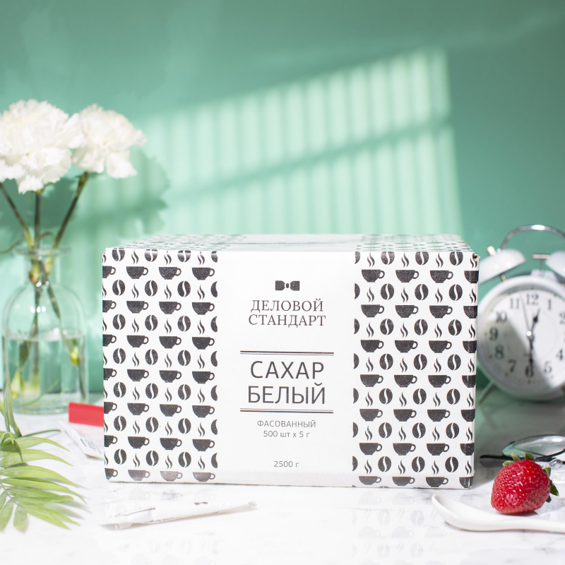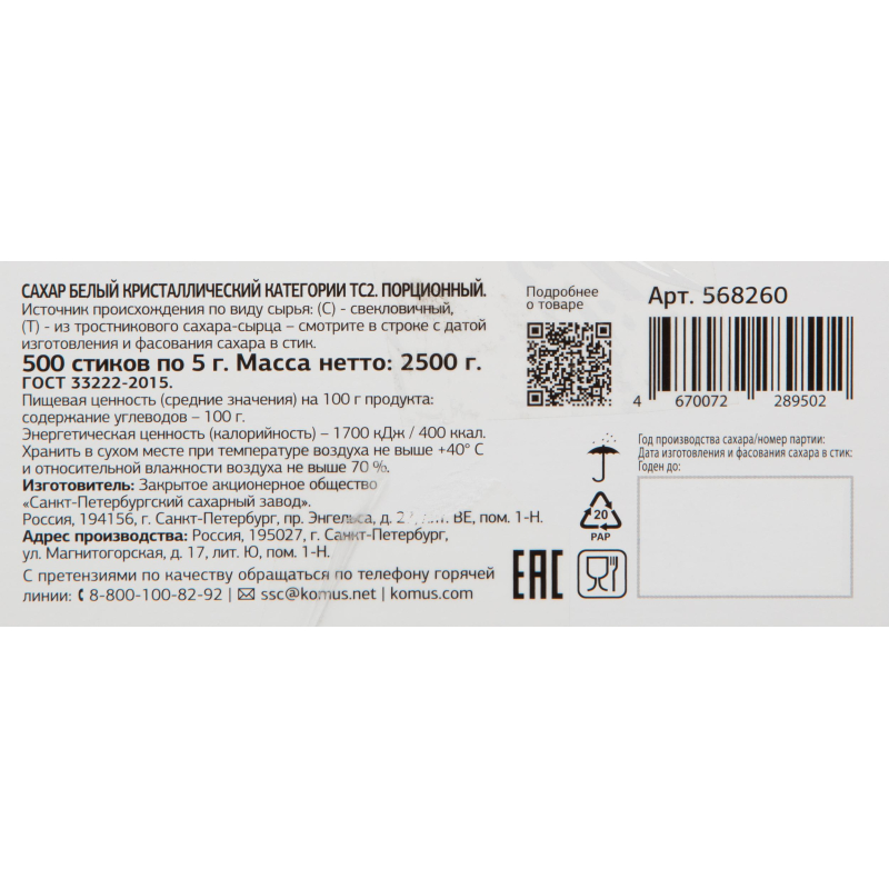Сахар белый кристаллический 500 шт х 5 гр. Пищевая ценность на 100 г продукта: углеводы: 100 г Энергетическая ценность на 100 г продукта: 400 Ккал Условия хранения: хранить при относительной влажности не более 70% и температуре 40 градусов Цельсия.