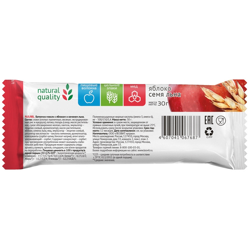 Батончик-мюсли с яблоком и семенем льна - сочетание отличного вкуса и пользы ингредиентов. Содержит злаки и фрукты, пищевые волокна, мед, Омега 3 и Омега 6. Для обеспечения нормальной жизнедеятельности человека в его организм обязательно должны поступать с пищей незаменимые полиненасыщенные жирные кислоты Омега 3 и Омега 6. Популярность полиненасыщенных жирных кислот связана с их многочисленными полезными свойствами, среди которых - положительное влияние на интеллектуальное развитие и работу мозга. Известно, что люди, в организме которых достаточно Омега 3, чаще пребывают в хорошем настроении и им неведома депрессия. Как известно, пищевые волокна из злаков и фруктов служат пищей для нормальной микрофлоры кишечника, способствуют быстрому насыщению, контролю аппетита и улучшают процессы пищеварения. Нежный вкус и аромат батончику придают яблоки и мед.