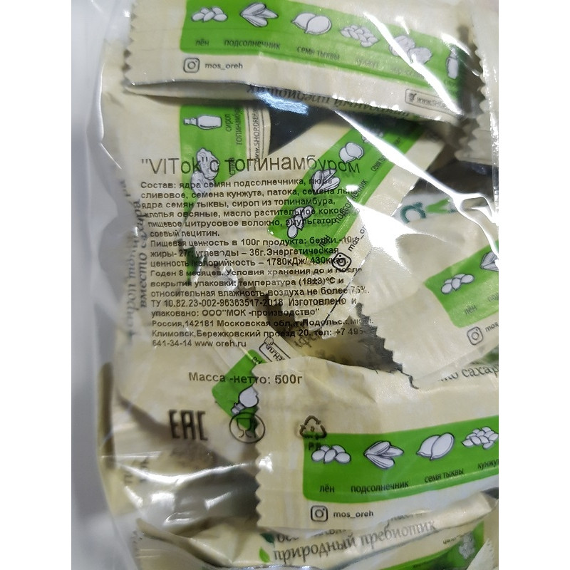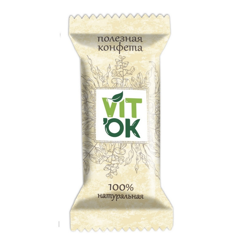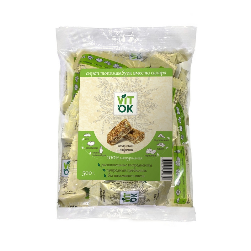 Полезная конфета 'VITOK' - это ваш правильный выбор идеального сочетания вкуса и пользы. Полезные конфеты являются источником кальция, магния, железа, а также витаминов Е и В1. Благодаря оптимально подобранной рецептуре, не содержащей сахара и заменителей, вы получаете все самое ценное из семян льна, тыквы, подсолнечника, кунжута и чернослива. Наслаждаетесь вкусом!