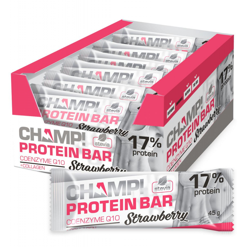 В клубничном батончике Champ отлично сочетается польза протеина, стевии, коллагена, коэнзима Q10, с насыщенным клубничным вкусом. В составе продукта 17% протеина (концентрированного сывороточного белка). Вариант полезного перекуса - с насыщенным карамельным вкусом, до и после занятий фитнесом, Батончик Champ клубничный позволяет всегда быть в хорошей физической форме, чувствовать себя бодрым и энергичным.Полезно, вкусно, да еще и удобно - за счет своего компактного размера батончик помещается в любой сумке, его всегда можно взять с собой в дорогу.