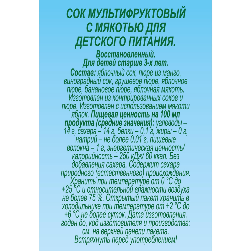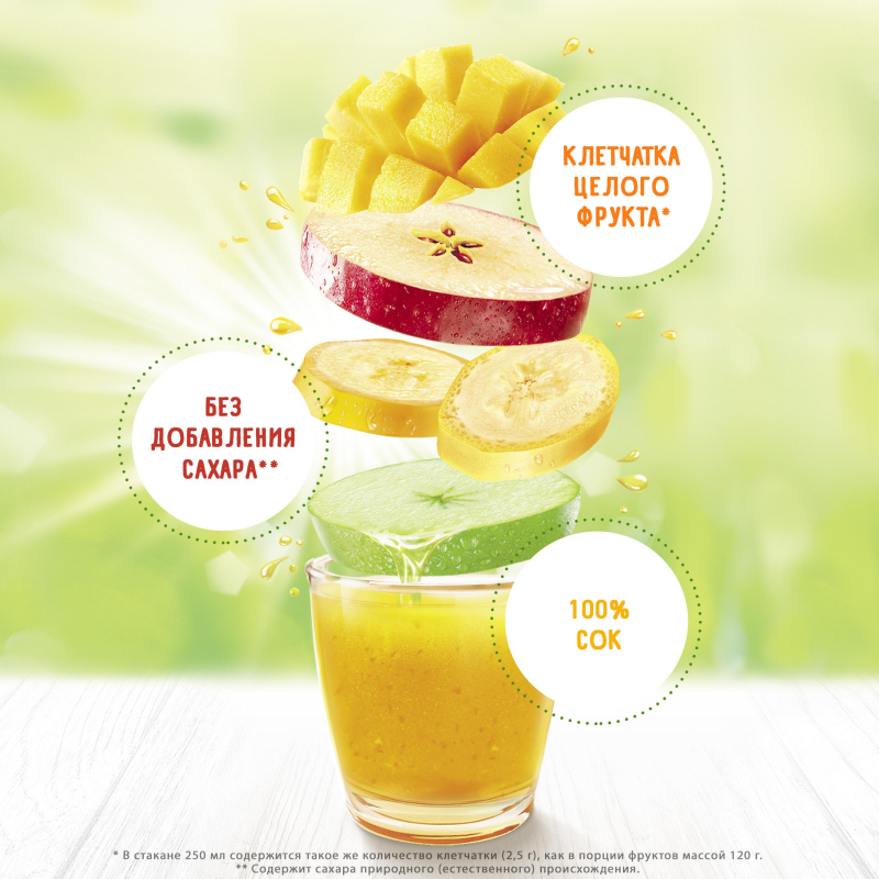 Сок J7 мультифрукт с мякотью 0.97 л. Вкусный освежающий коктейль из соков нескольких тропических фруктов: манго, ананаса, апельсина и банана. Напиток имеет приятный экзотический вкус, а в составе нет никаких вредных веществ, консервантов и красителей искусственного происхождения. Новая стильная картонный пакет, оснащена удобной завинчивающейся крышкой, которая не даст напитку пролиться, даже если пакет упадет. Поэтому нектар можно брать с собой в путешествие или на пикник. Предназначен для питания детей c 3-х лет. Состав: яблочное пюре, ананасовый сок, яблочный сок, апельсиновый сок, пюре манго, лимонный сок, банановое пюре, абрикосовое пюре, сок маракуйи, сахар (S)x или глюкозно-фруктозный сироп (G)x, вода. Пищевая ценность на 100 г продукта (не менее): углеводы - 12,5 г; натрий - 3 мг; клетчатка - 40 мг; белок - 50 мг; природное содержание витамина С - 3,5 мг. Энергетическая ценность на 100 г продукта: 51 ккал. Поставляется в картонной упаковке. Хранить при температуре от 0 °C до 25 °C и относительной влажности воздуха не более 75%. Открытый пакет хранить в холодильнике при температуре от 2 °C до 6 °C не более суток. Производитель: ОАО Вимм-Билль-Данн Напитки. Страна производства: Россия.