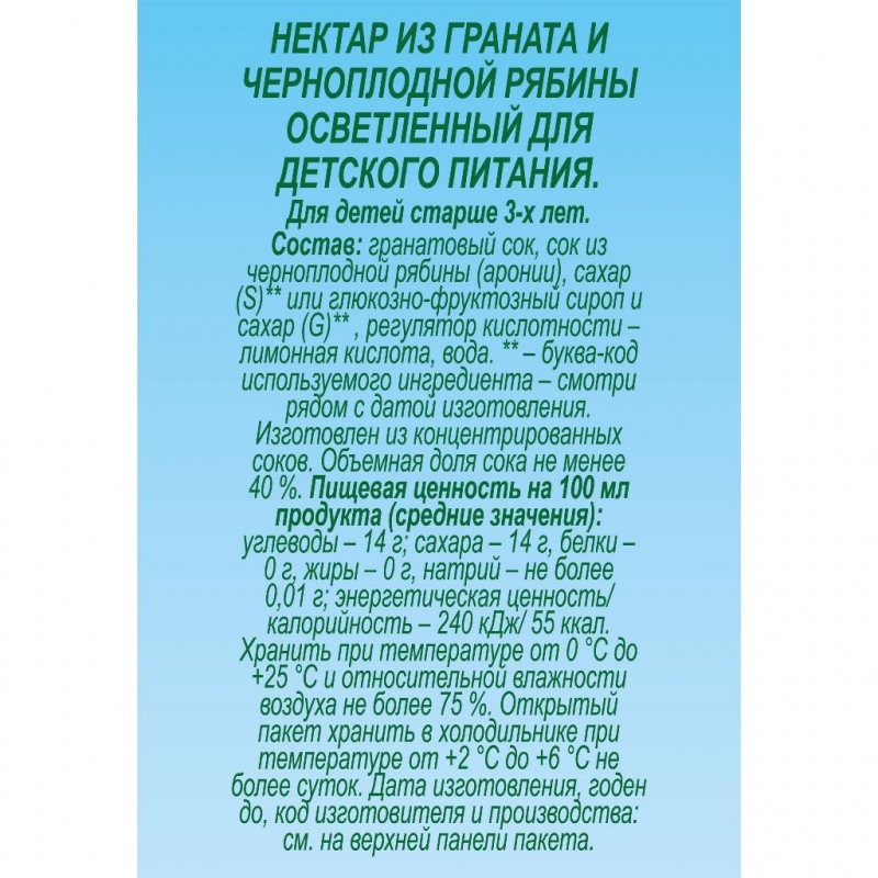 Cок J7 - это яркое сочетание спелых фруктов, многообразие вкусовых оттенков и ничего лишнего. Яркость вкуса и аромат сочных фруктов помогут зарядиться отличным настроением с самого утра провести каждый день с пользой. Без добавления консервантов. Изысканный вкус спелого граната в сочетании с терпкими нотками черноплодной рябины - в каждом глотке. Для ежедневного потребления. Вкусное и полезное начало дня! Делает утро ярче! J7 - торговая марка соков и нектаров, выпускаемых компанией PepsiCo. Первый пакет сока J7 был произведен компанией Вимм-Билль-Данн в 1994 году. Именно с него началась история пакетированных соков в России. Нектар J7 Гранат с добавлением черноплодной рябины 0.97 л. Осветленный, стерилизованный, без консервантов. Изготовлен из концентрированных соков. Состав: гранатовый сок, сок черноплодной рябины, сахар, регулятор кислотности - лимонная кислота, вода. Минимальная объемная доля фруктового сока не менее 40%. Пищевая ценность: углеводы - 12.6 г, белки - 0 мг, натрий - 3 мг. Энергетическая ценность: 52 ккал. Хранить при t от 0 до + 25°C. Открытый пакет хранить в холодильнике не более суток. Срок годности 12 месяцев. ТУ 9163-052-05269043-05