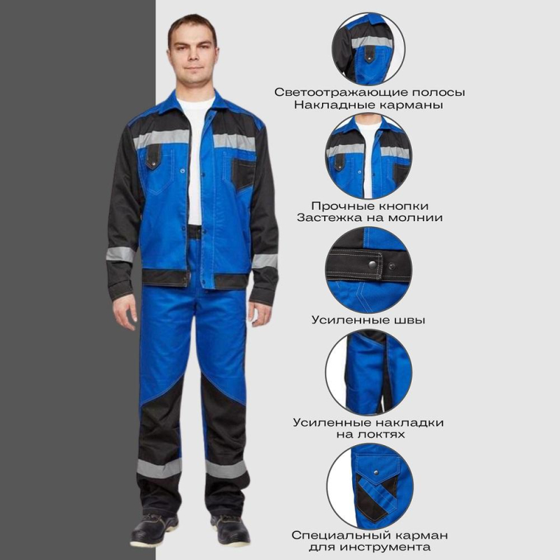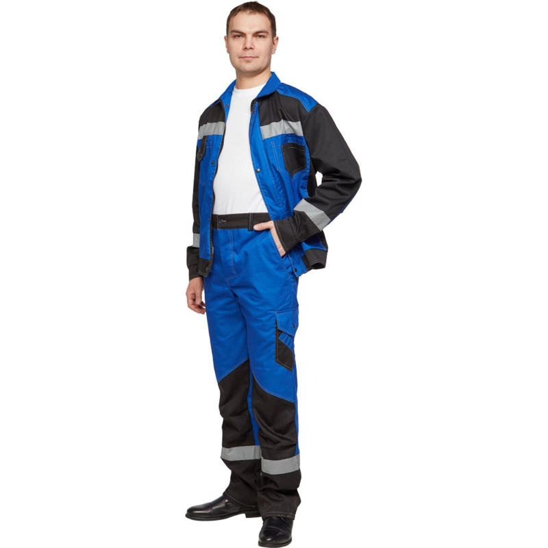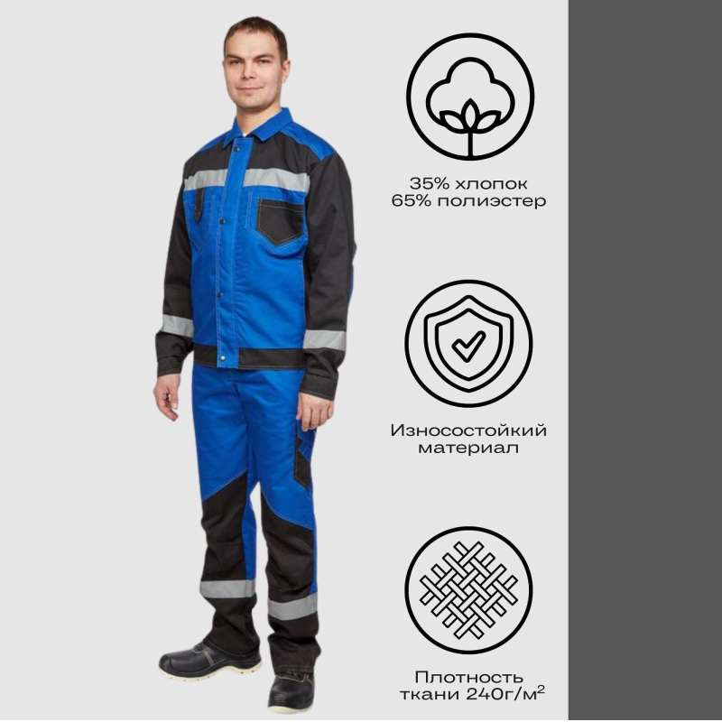Спецодежда летняя костюм мужской л21-КБР состоит из куртки и брюк (размер 64-66, рост 182-188). Изготовлен из смесовой ткани (65% полиэстер, 35% хлопок) плотностью 240 г/кв.м. Светоотражающая полоса шириной 50 мм размещена на груди, спине, рукавах, а также внизу брюк. Куртка c застежкой на молнию и кнопки. На куртке два верхних накладных кармана. Рукава с налокотниками и манжетами. Ширина пояса куртки регулируется кнопками. Брюки прямого силуэта с застежкой на пуговицы. На передней половине брюк расположены два накладных кармана со скошенным входом. На брюках сзади 2 накладных кармана, один из которых на кнопке, а также боковой накладной карман на кнопке. Весь костюм сшит контрастными нитками белого цвета, двойной строчкой. Костюм предназначен для защиты от общих производственных загрязнений и механических воздействий. ГОСТ 12.4.280-2014, ТР ТС 019/2011. Сферы применения: сельское хозяйство, логистика, легкая промышленность, строительство, тяжелая промышленность. Коллекция рабочей одежды л21 представлена двумя видами комплектов: куртка и полукомбинезон л21-КПК и куртка и брюки Л21-КБР. ЗАКОНОДАТЕЛЬНЫЕ И ТЕХНИЧЕСКИЕ ДОКУМЕНТЫ: