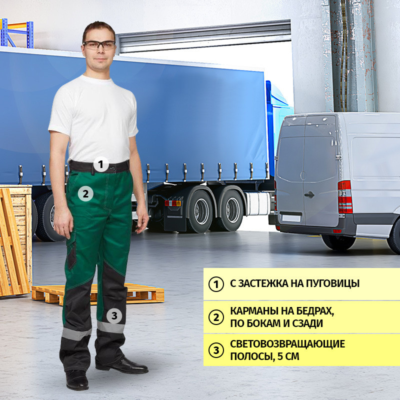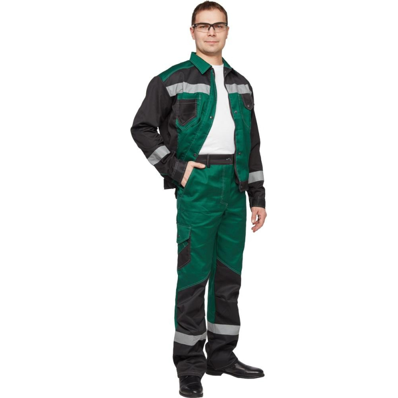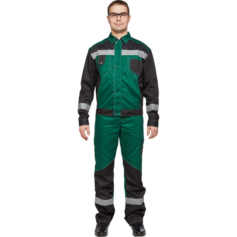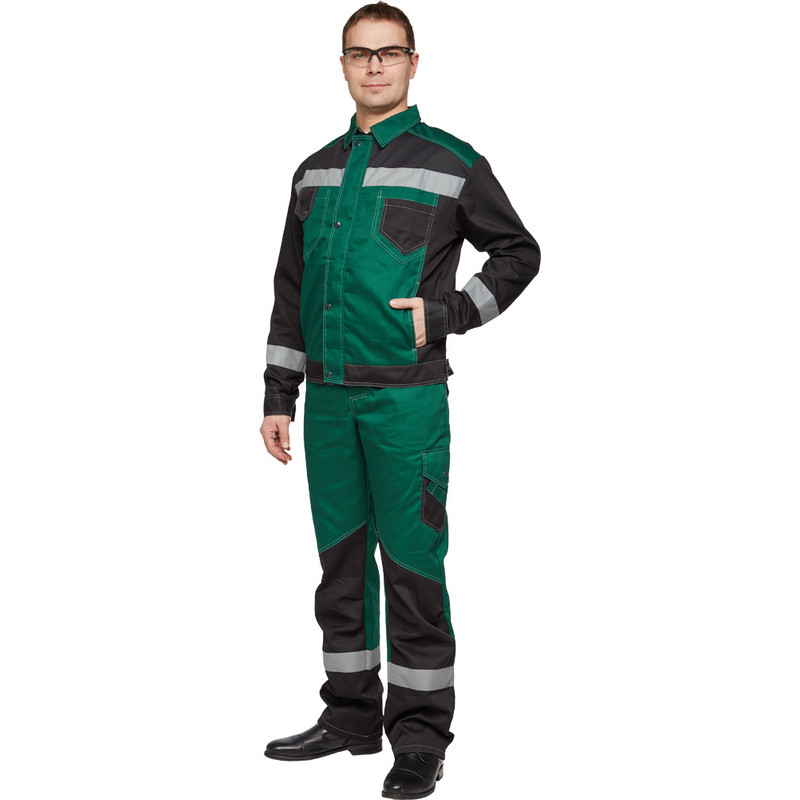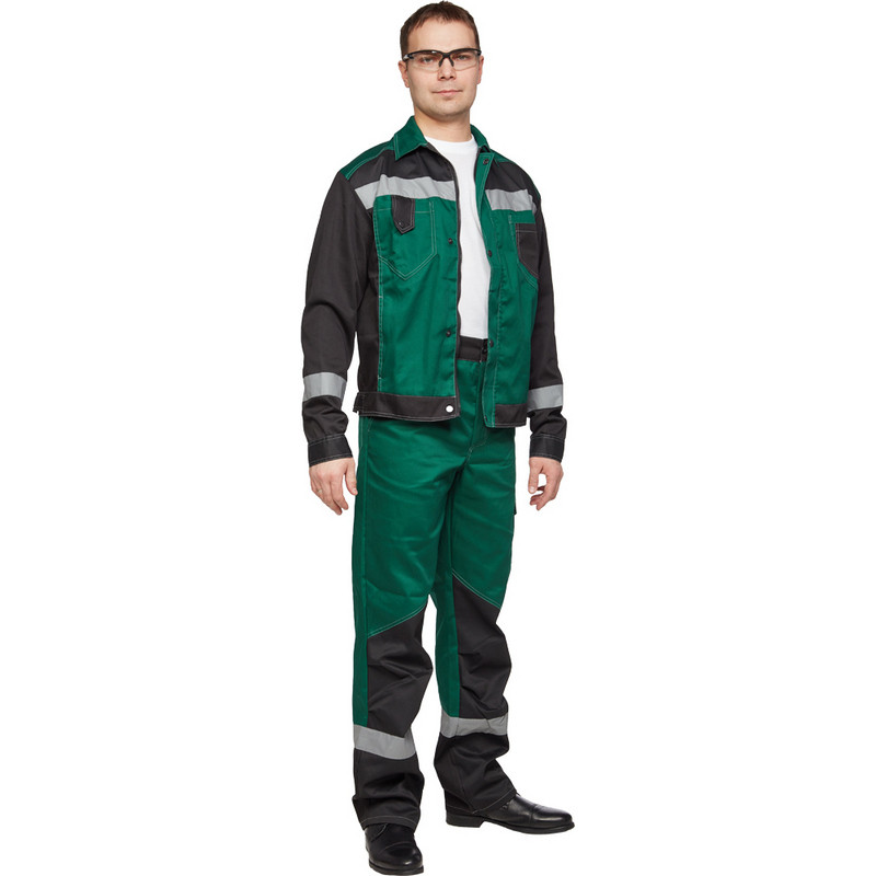 Спецодежда летняя костюм мужской л21-КБР состоит из куртки и брюк (размер 44-46, рост 182-188). Изготовлен из смесовой ткани (65% - полиэстер, 35% - хлопок) плотностью 240 г/кв.м. Светоотражающая полоса шириной 50 мм размещена на груди, спине, рукавах, а также внизу брюк. Куртка c застежкой на молнию и кнопки. На куртке два верхних накладных кармана. Рукава с налокотниками и манжетами. Ширина пояса куртки регулируется кнопками. Брюки прямого силуэта с застежкой на пуговицы. На передней половине брюк расположены два накладных кармана со скошенным входом. На брюках сзади 2 накладных кармана, один из которых на кнопке, а также боковой накладной карман на кнопке. Весь костюм сшит контрастными нитками белого цвета, двойной строчкой. Костюм предназначен для защиты от общих производственных загрязнений и механических воздействий. ГОСТ 12.4.280-2014, ТР ТС 019/2011. Сферы применения: сельское хозяйство, логистика, легкая промышленность, строительство, тяжелая промышленность.Коллекция рабочей одежды л21 представлена двумя видами комплектов: куртка и полукомбинезон л21-КПК и куртка и брюки Л21-КБР. ЗАКОНОДАТЕЛЬНЫЕ И ТЕХНИЧЕСКИЕ ДОКУМЕНТЫ: