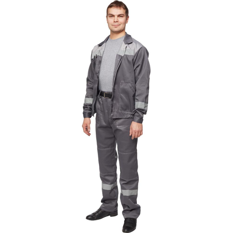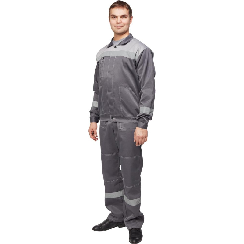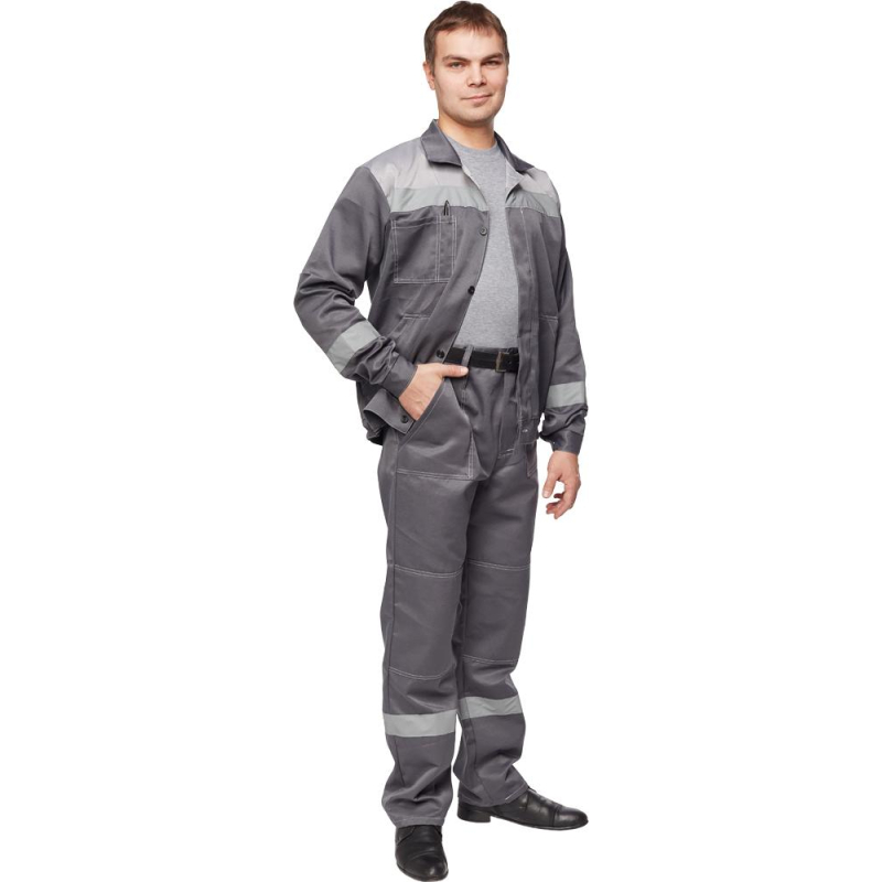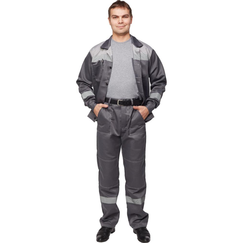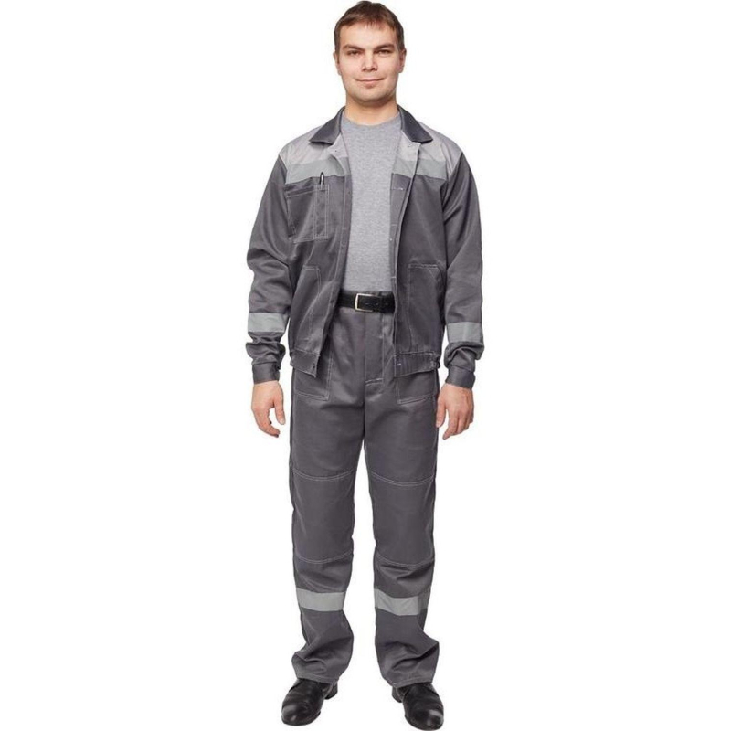 Спецодежда летняя костюм мужской л22-КБР состоит из куртки и брюк (размер 48-50, рост 170-176). Изготовлен из смесовой ткани (80% полиэстер, 20% хлопок) плотностью 210 г/кв.м. Светоотражающая полоса шириной 50 мм размещена на груди, спине, рукавах, а также внизу брюк. Куртка укороченная на поясе, с супатной застежкой на пять петель-пуговиц. Полочка отрезная по линии кокетки, подбор цельнокроеный. Воротник отложной, на куртке три накладных кармана: один верхний нагрудный карман справа с отсрочкой под ручку и два нижних кармана с боковым входом. Рукава с налокотниками и манжетами. Спинка отрезная по линии кокетки. Пояс притачной шириной 4-5 см, с эластичной лентой по бокам. Брюки прямого силуэта, оснащены наколенниками, наличие пяти шлевок. На передней половине брюк расположены два накладных кармана со скошенным входом, гульф (молния). Пояс с пятью шлевками. Весь костюм сшит контрастными нитками белого цвета, двойной строчкой. Костюм предназначен для защиты от общих производственных загрязнений и механических воздействий. ГОСТ 12.4.280-2014, ТР ТС 019/2011. Сферы применения: сельское хозяйство, логистика, легкая промышленность, строительство, озеленение. Коллекция рабочей одежды л22 представлена двумя видами комплектов: куртка и полукомбинезон л22-КПК и куртка и брюки Л22-КБР. ЗАКОНОДАТЕЛЬНЫЕ И ТЕХНИЧЕСКИЕ ДОКУМЕНТЫ: