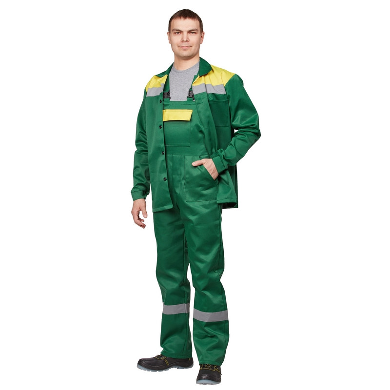 Спецодежда летняя костюмы летний мужской Механик состоит из куртки и брюк. Изготовлен из смесовой ткани плотностью 190 г/кв.м (80% полиэстер, 20% хлопок). Оснащен светоотражающими полосами. Куртка удлиненная, прямой силуэт, с двумя боковыми и одним нагрудным накладными карманами. Брюки имеют застежку гульфика на пуговицы, два накладных кармана. Размер костюма - 68-70, рост - 170-176. Сферы применения: сельское хозяйство, логистика, легкая промышленность, строительство, озеленение. Коллекция рабочей одежды л02 представлена комплектами: куртка с брюками л02-КБР и куртка с полукомбинезоном л02-КПК также в зеленом цвете с желтой отделкой.