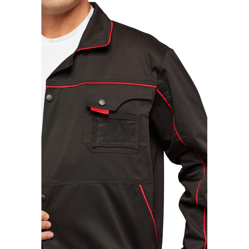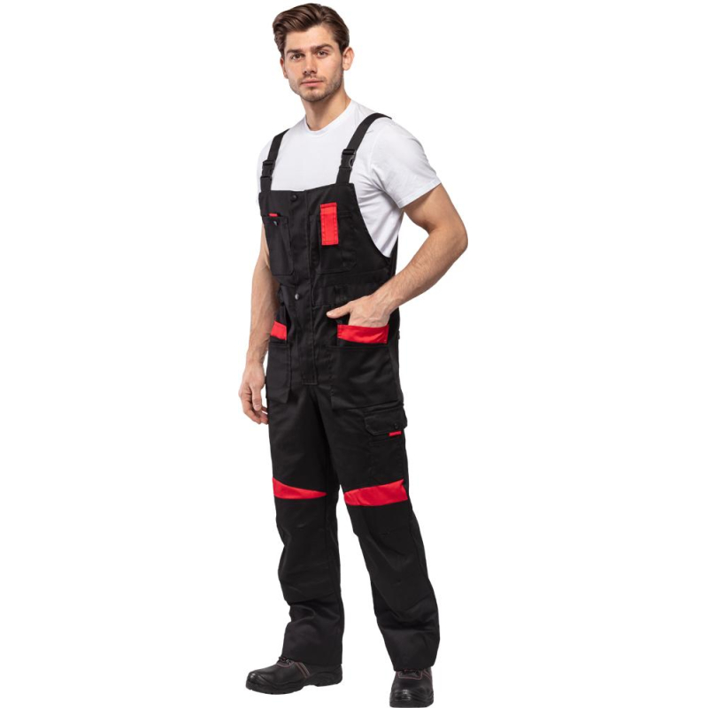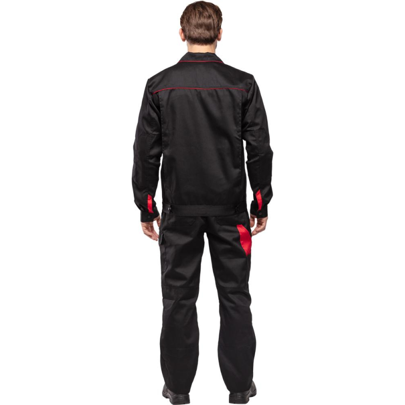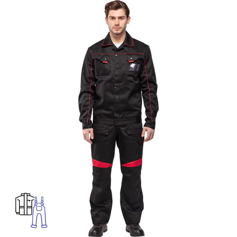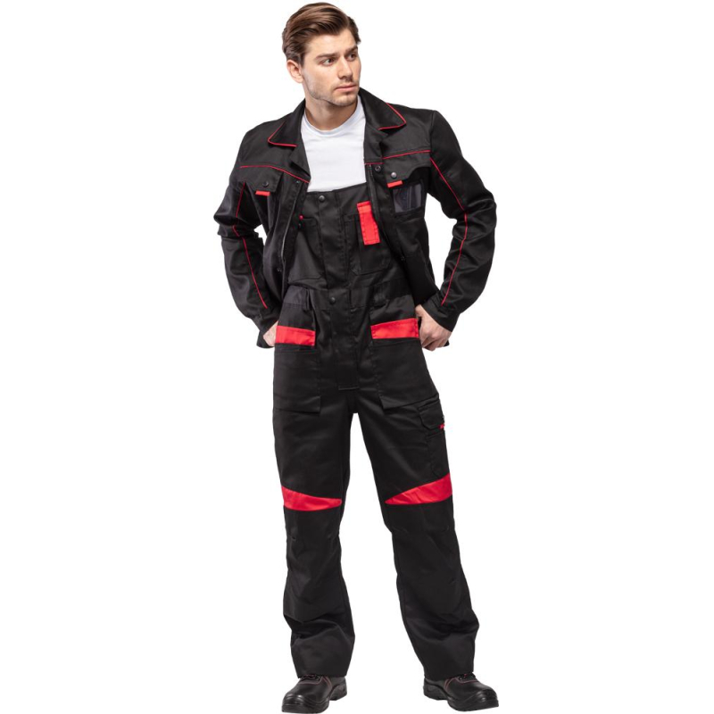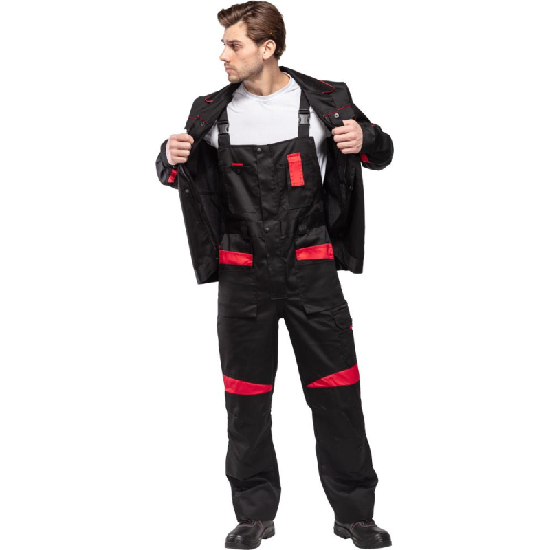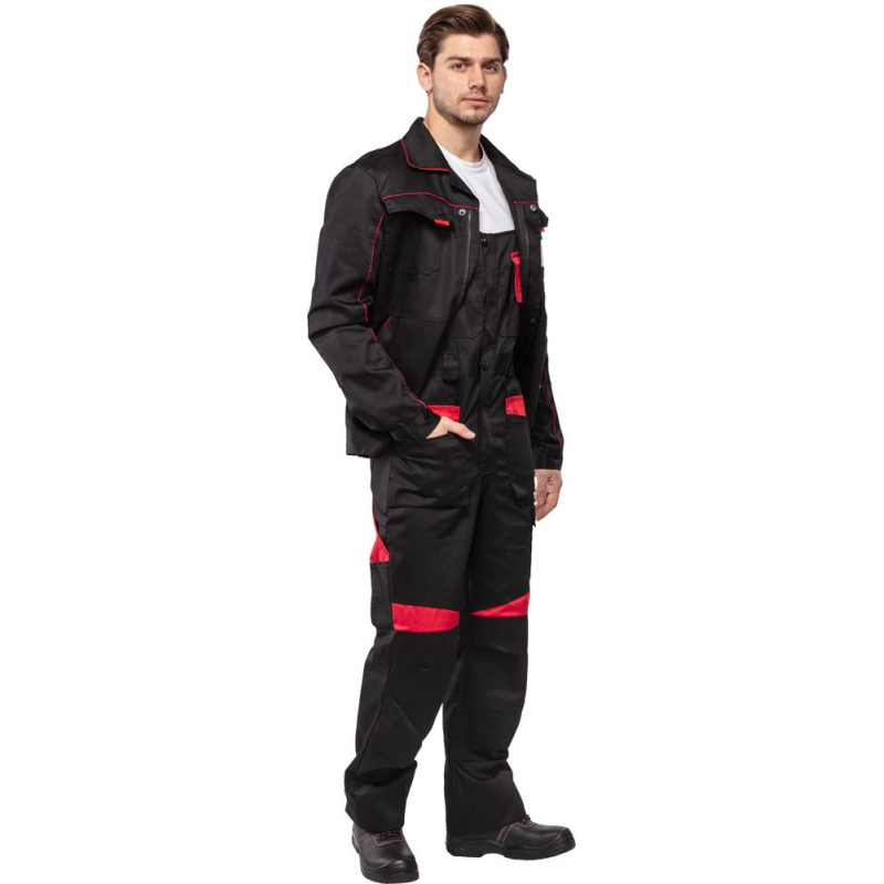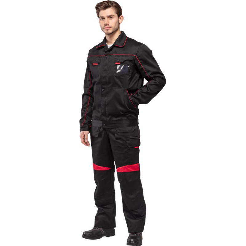 Спецодежда летняя костюм мужской л29-КПК состоит из укороченной куртки на поясе, и полукомбинезона. Куртка имеет центральную застежку на молнию, закрытую планкой на кнопках. Куртка имеет 2 верхних накладных фигурных кармана, застегивающихся на кнопку. На левом верхнем кармане дополнительно настрочен карман под бейдж. В нижней части куртки располагаются 2 вместительных накладных кармана с боковым входом. Куртка имеет складки на спине для свободы движения. На локтях имеются усиления. Пояс куртки регулируется патами на кнопках. Полукомбинезон с высокими грудкой и спинкой, бретели имеют вставки из резинки, регулируются по длине и застегиваются на фастексы. Застежка полукомбинезона на молнию, закрытую планкой на кнопках. По линии талии имеются двойные шлевки под ремень. На полукомбинезоне имеется множество функциональных карманов: накладные и навесные. В районе коленей имеются усиления со входом под амортизационные вставки. Цвет: черный с красной отделкой. Материал: 65% полиэстер, 35% хлопок. Плотность: 240 г/кв.м. Размер: 44-46. Рост: 182-188. Стандарт: ГОСТ 12.4.280-2014. Сфера применения: логистика , легкая промышленность , тяжелая промышленность , строительство , озеленение , автомобильная.Коллекция л29 представлена комплектами куртка и полукомбинезон л29-КПК в двух вариантах расцветки: черный с красной отделкой и темно-серый с отделкой ярко-оранжевого цвета.