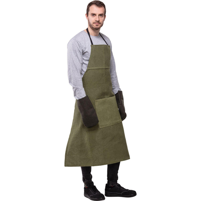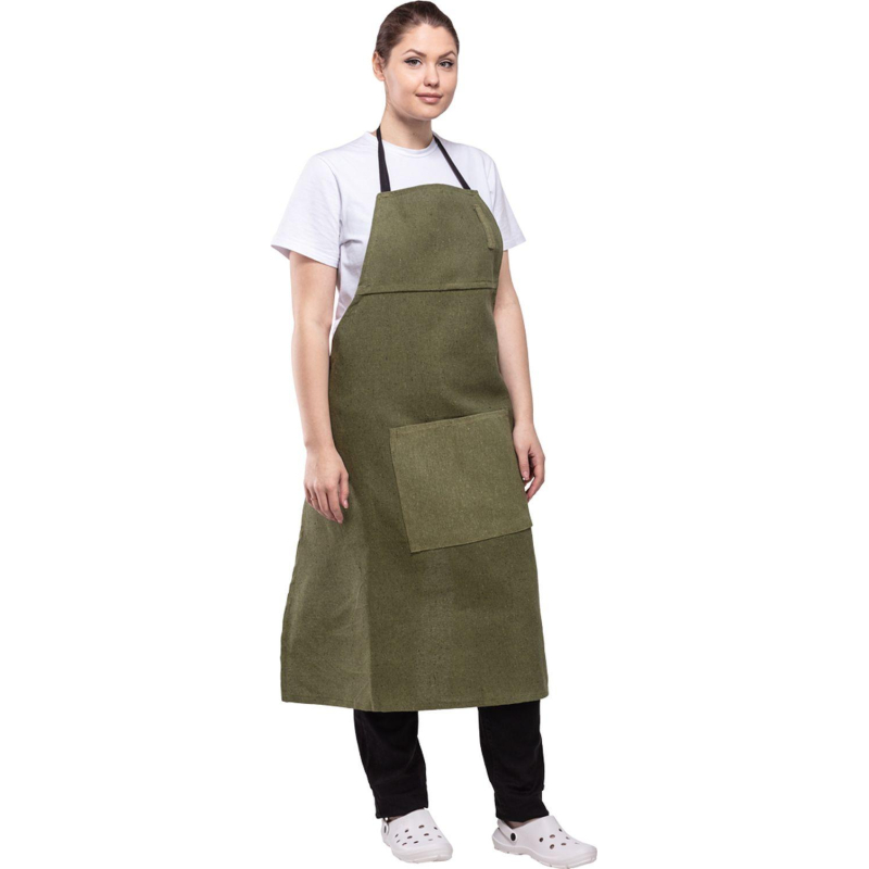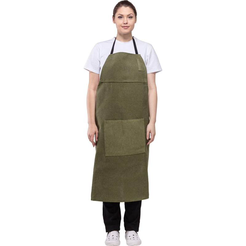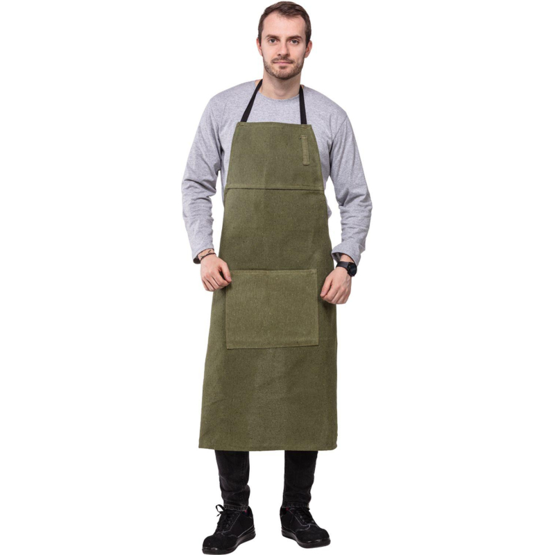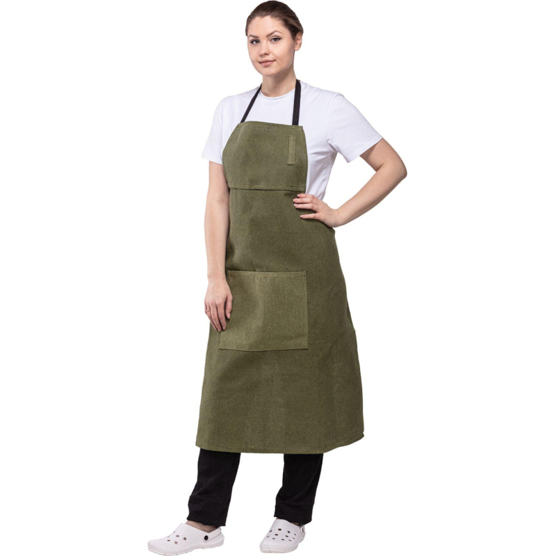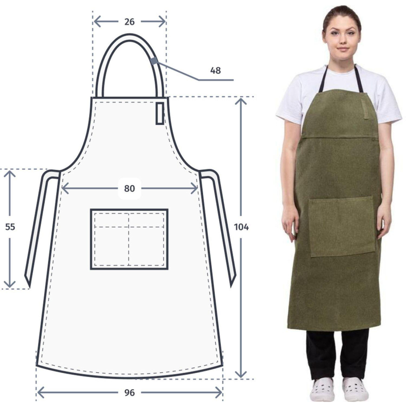 Фартук с цельнокроеным нагрудником и притачанной к боковым углам на уровне талии тесьмой для завязывания. Фартук цвета хаки предназначен для защиты при работе с грубыми материалами. Ткань - брезент (100% парусина). Плотность: 350 г/кв.м. Длина фартука: 104 см. Длина завязок: 55 см. Ширина фартука по талии, где завязки: 80 см. Ширина низа фартука: 96 см. Тип А - фартук защищает передний участок тела работника.