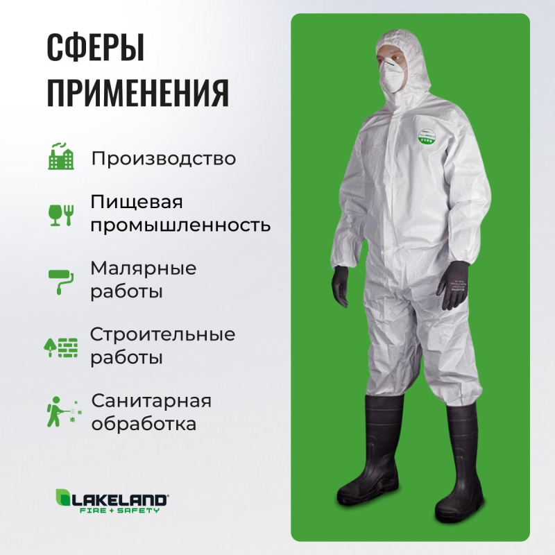 Комбинезон одноразовый с капюшоном Lakeland MicroMAX NS белого цвета - это защита самого щирокого спектра, от сухих и жидких сред - опасная пыль, водные растворы химических веществ, масел, бензина, смол, нефтепродуктов, химических веществ не высокого класса. Не образует ворса, антистатичен. Ткань: спанбонд, микропористая пленка. Плотность 55 г/кв.м. Оптимально подобранные швы и конструктивные особенности комбинезона гарантируют высокую степень защиты. Материал обладает высочайшей степенью инфекционной защиты, отвечает требованиям по защите от радиоактивных частиц. Тип защиты: 5 (EN 13882-1) - защита от опасных сухих веществ, тип 6 (EN 13034) - защита от небольших брызг растворов химических веществ, легких брызг неопасных жидкостей. Костюм отвечает требованиям по защите от радиоактивных частиц. Элементы комбинезона: манжеты и капюшон на резинке, резинка на поясе, капюшон из трех частей, втачные рукава, ластовица. Область применения: гигиена, пищевая промышденность, химическое производство. Размер 46-50, рост 170-176 (M).