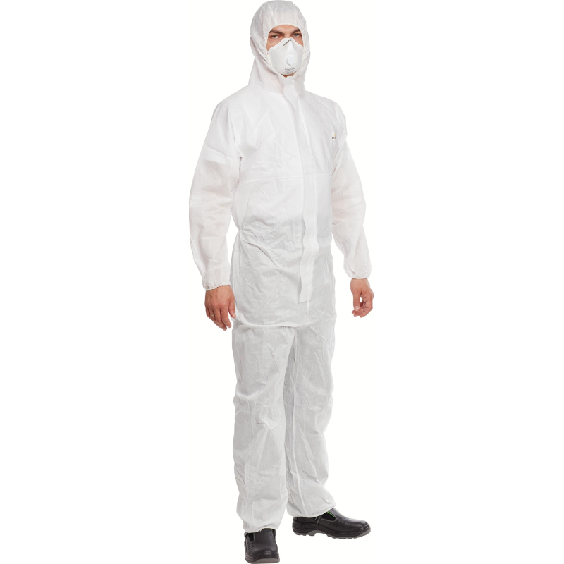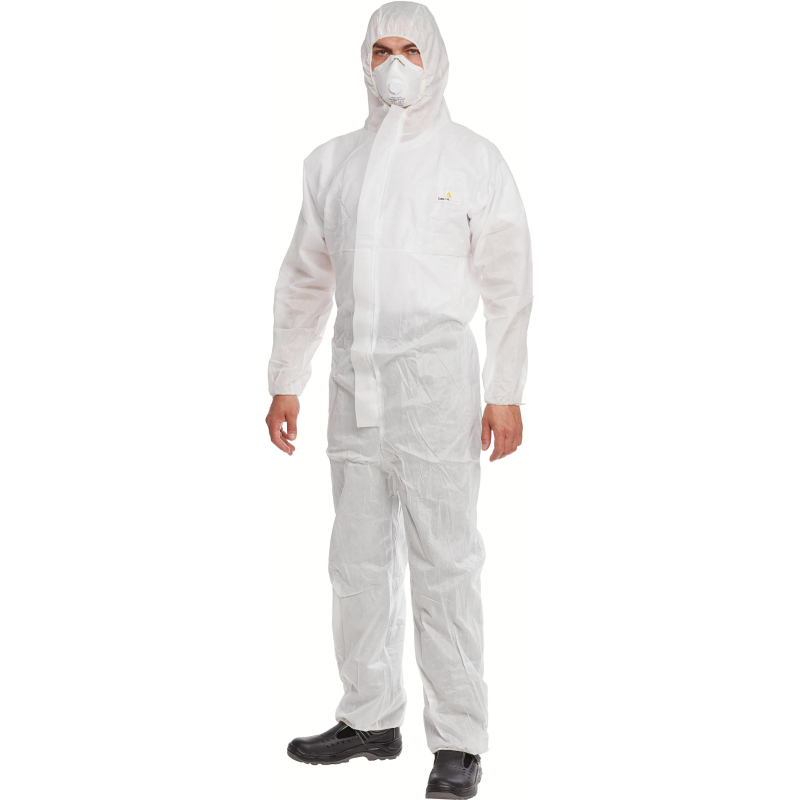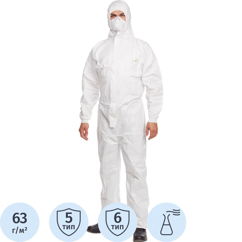 Одноразовый комбинезон изготовлен из нетканого микропористого и ламинированного материала Deltatek 5000 (60% полипропилен, 40% полиэтилен). Обеспечивает хорошую паро-воздухопроницаемость. Модель обладает хорошими свойствами, качественная. Застежка-молния, закрытая защитной планкой. Эластичная резинка вокруг лицевого выреза капюшона, на талии, манжетах рукавов и лодыжках. Прочная и эластичная ткань устойчивая к механическим воздействиям, плотность ткани составляет 63 г/м. Защита от твердых частиц-5, от брызг кислот, щелочных веществ и воды, антистатические свойства. Цвет белый. Соответствует стандартам ТР ТС 019/2011,ГОСТ EN ISO 13982-1-2012 тип 5, EN13034 тип 6-В, ГОСТ Р ЕН 1149-5-2008, ГОСТ ISO 16602-2019. Область применения: малярные работы, пищевая промышленность, очистка производственных помещений и оборудования, утилизация и переноска асбеста, фармацевтическая промышленность, защита от легких брызг невысокой опасности и опасных сухих частиц, монтаж изоляции, дерево и металлообработка, общее промышленное применение. Размер 48-50 (L), рост 174-181 см, обхват груди 100-108 см.