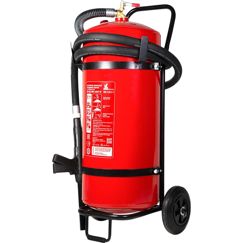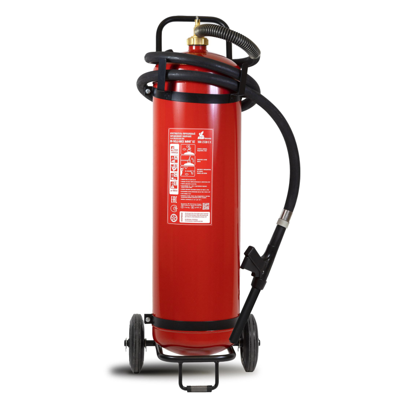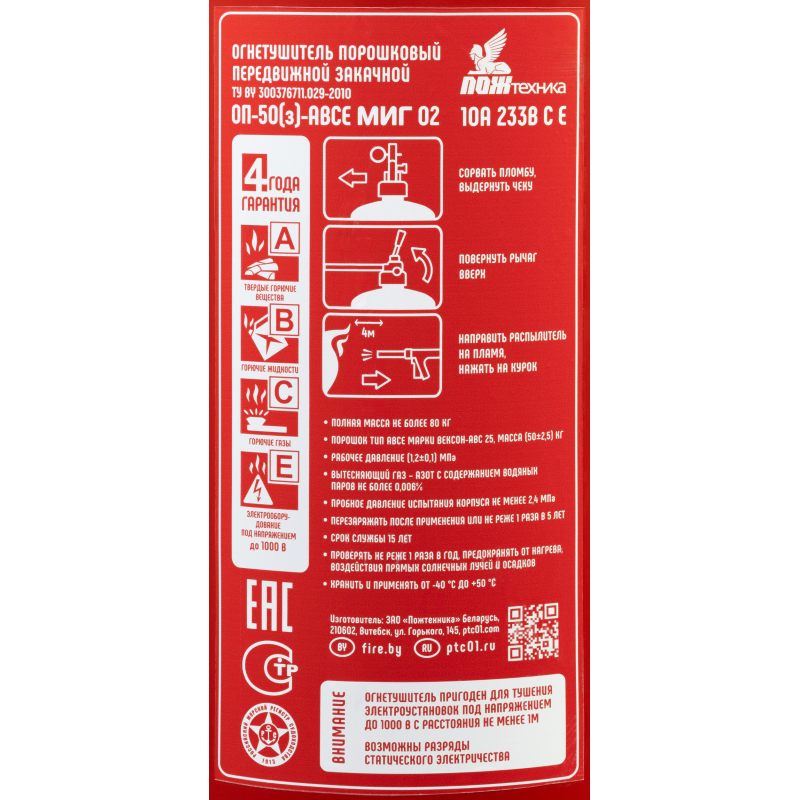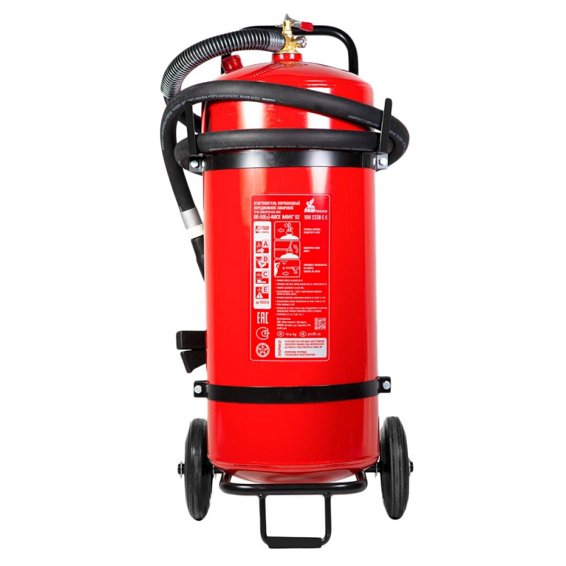 Огнетушитель порошковый ОП-50(з) 'Миг' ABCE - передвижной огнетушитель с зарядом 50 кг. Предназначен для защиты складских и производственных помещений, а также автозаправочных станций. Широко применяется на судах. Имеет удобную съемную тележку, обрезиненные колеса, морозостойкий резиновый распылитель. Рекомендуется использовать при температуре от -40 до 50 °C. Огнетушитель способен подавать струю огнетушащего состава на расстояние не менее 6 метров. Огнетушащая способность (ранг огнетушителя): 10А, 233В, С, Е (электроустановки под напряжением до 1000 В). Вес огнетушителя: 80 кг. Вес огнетушащего порошка: 50 кг. Марка порошка: Вексон-АВС 25. Время подачи огнетушащего вещества: 30 секунд. Площадь тушения: 27.7 кв.м. Объем баллона: 62 литра. Диаметр баллона: 330 мм. Паспорт баллона нанесен заводским клеймением по ТР ЕАЭС 032/2013. Гарантийный срок: 48 месяцев. Срок службы огнетушителя: 15 лет. Производитель: 'Пожтехника' Беларусь. Комплектация: огнетушитель, распылитель, паспорт, тележка. Соответствует стандарту ГОСТ Р51017-2009. Внимание! Товар поставляется в двух вариантах конструкции без возможности выбора. Перезарядка осуществляется через 5 лет с даты производства огнетушителя.