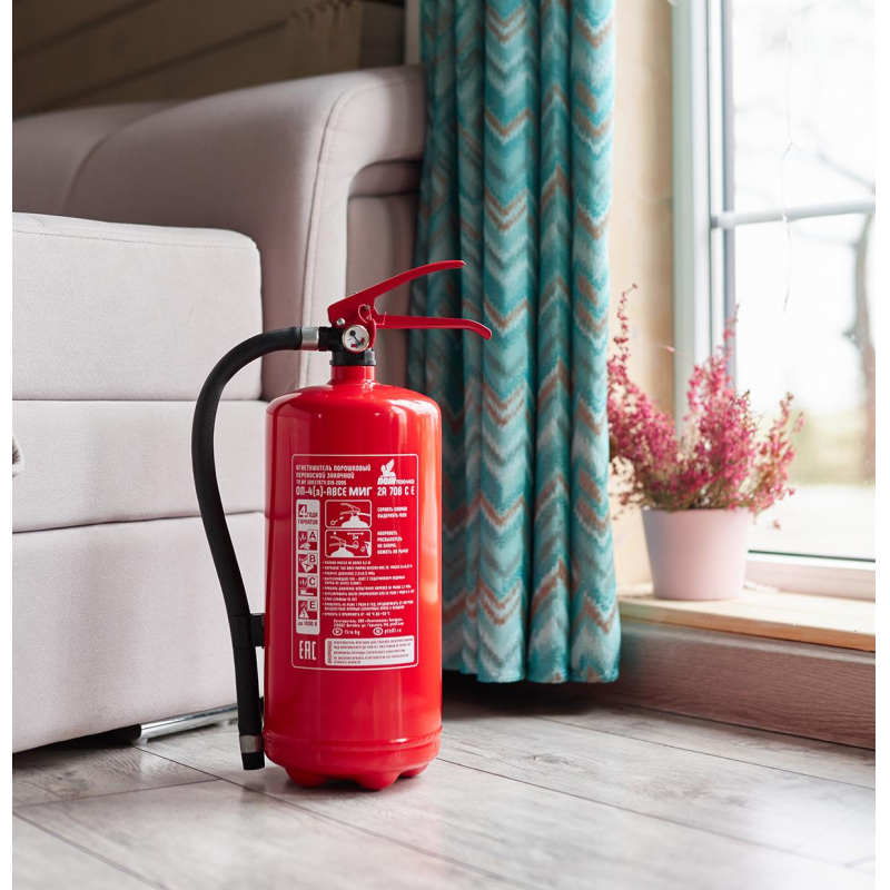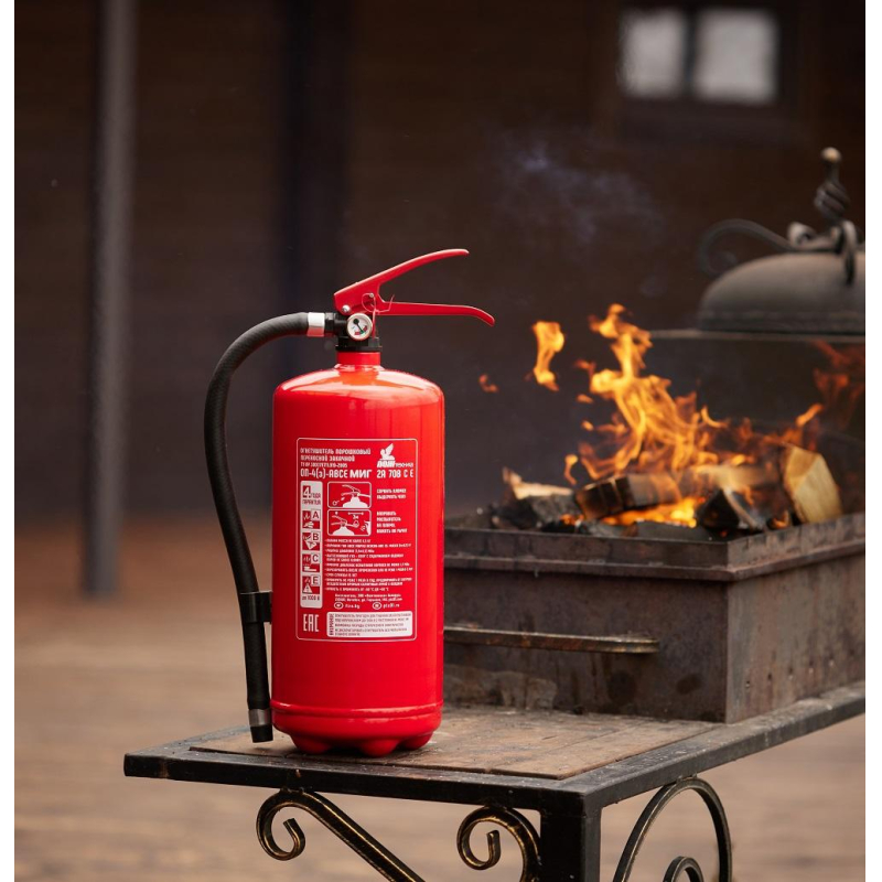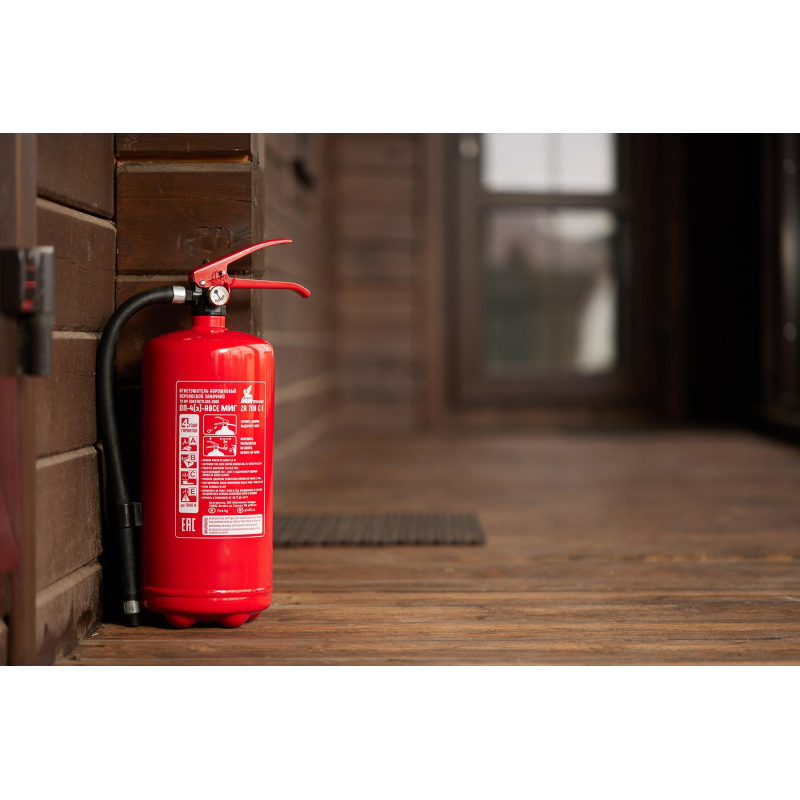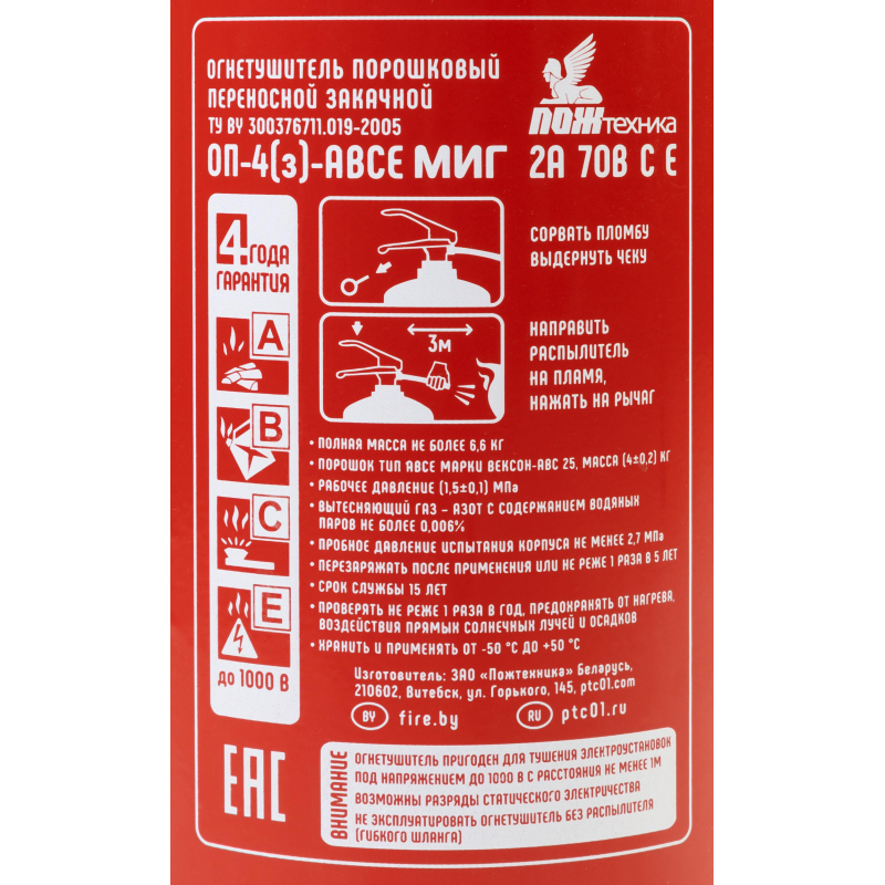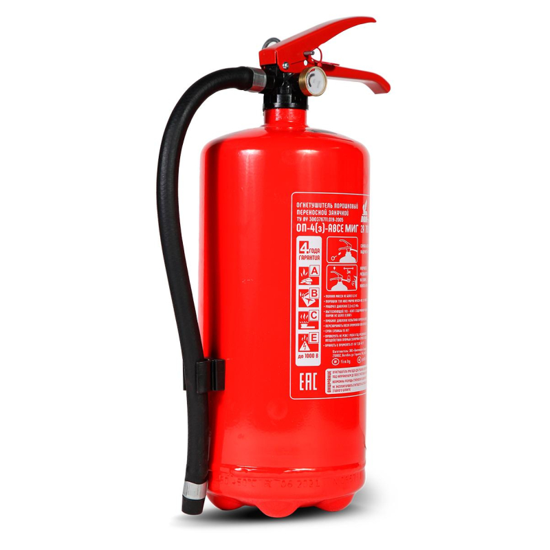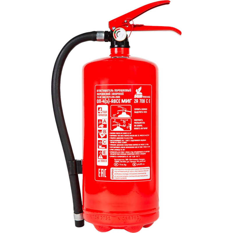 Огнетушитель порошковый ОП-4(з) 'Миг' ABCE закачной огнетушитель для защиты общественных зданий и помещений категорий Г и Д. Применяется также на грузовых автомобилях и автобусах МАЗ. Эффективен при тушении горючих жидкостей и газов, твердых веществ и электрооборудования под напряжением до 1000 В. Рекомендуется использовать при температуре от -50 до +50 °C. Огнетушитель способен подавать струю огнетушащего состава на расстояние не менее 3-х метров. Огнетушащая способность (ранг огнетушителя): 2А, 70В, С, Е (электроустановки под напряжением до 1000 В). Вес огнетушителя: 6.3 кг. Вес огнетушащего порошка: 4 кг. Марка порошка: Вексон-АВС 25. Время подачи огнетушащего вещества: 10 секунд. Площадь тушения: 9.36 кв.м. Объем баллона: 5 литров. Диаметр баллона: 150 мм. Паспорт баллона нанесен заводским клеймением по ТР ЕАЭС 032/2013. Гарантийный срок: 48 месяцев. Срок службы огнетушителя: 15 лет. Производитель: 'Пожтехника' Беларусь. Аксессуары: - настенный кронштейн Миг арт.366662; - подставка напольная Престиж арт.366664, 366665, 391384; - транспортный кронштейн: КТР-4/5 'МИГ' арт. 366661. Комплектация: распылитель, паспорт. Соответствует ствндарту ГОСТ Р51057-2001. Перезарядка осуществляется через 5 лет с даты производства огнетушителя.