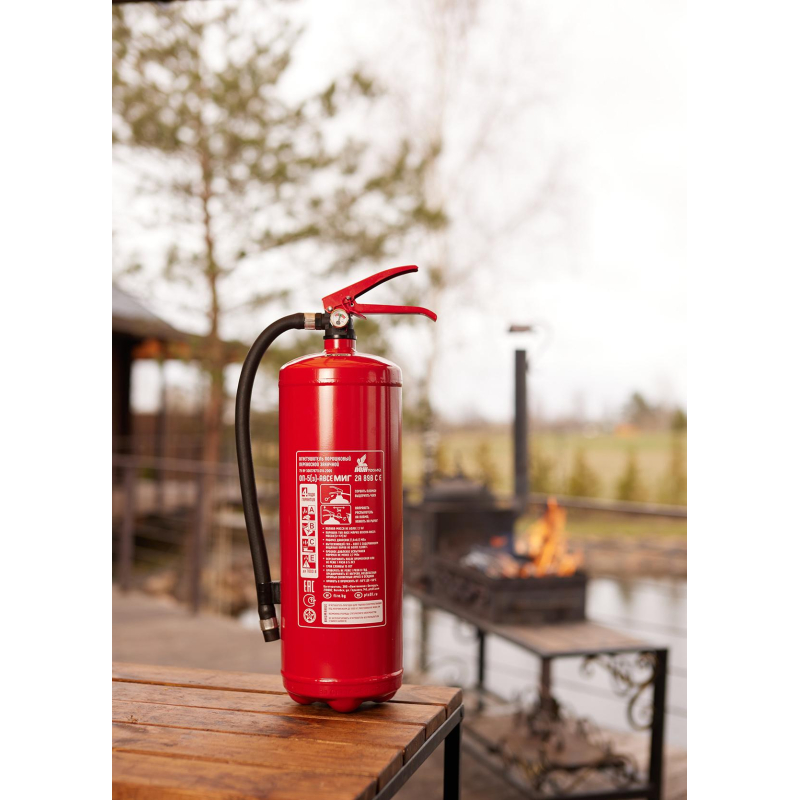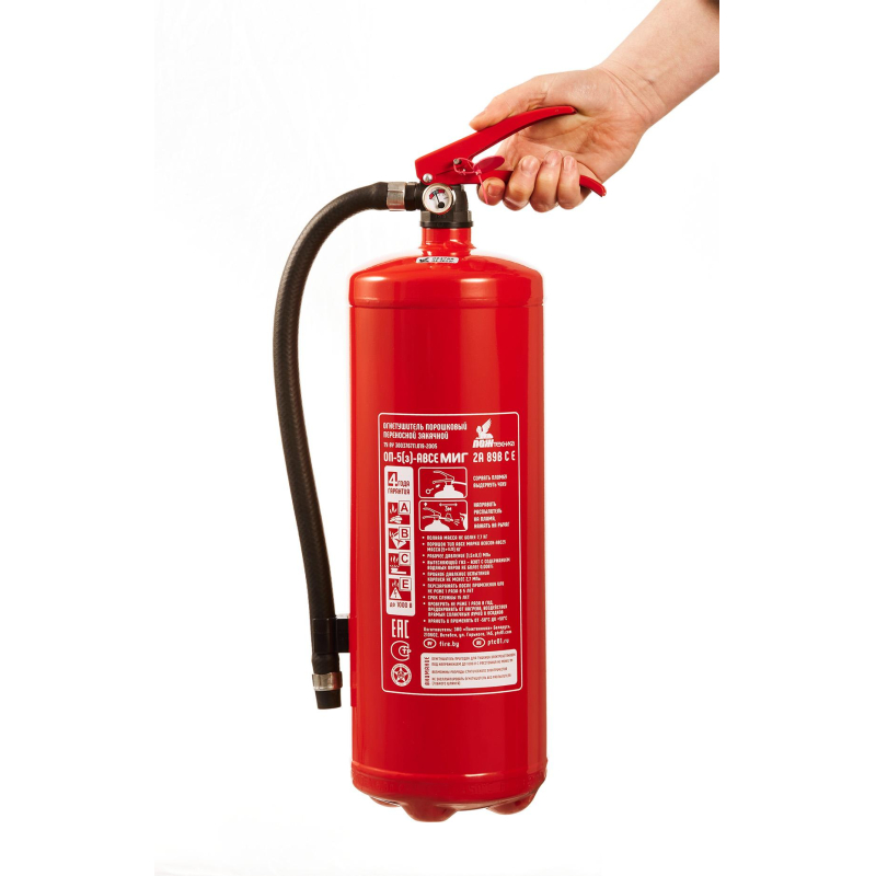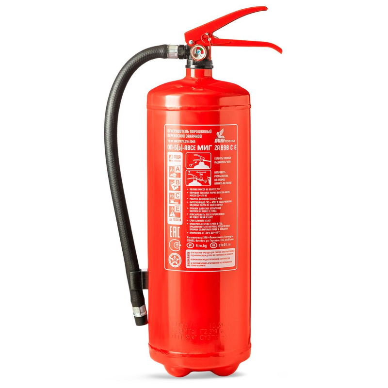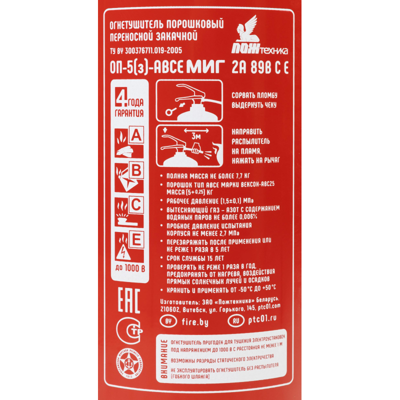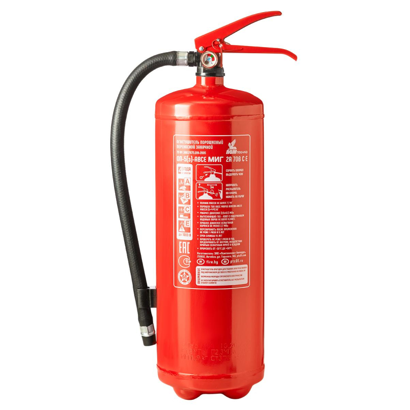 Огнетушитель порошковый ОП-5(з) 'Миг' ABCE - универсальный закачной огнетушитель с зарядом 5 кг для защиты общественных зданий и помещений категорий Г и Д. Применяется также на автотранспорте. Эффективен при тушении горючих жидкостей и газов, твердых веществ и электрооборудования под напряжением до 1000 В. Рекомендуется использовать при температуре от -50 до +50 °C. Огнетушитель способен подавать струю огнетушащего состава на расстояние не менее 3-х метров. Огнетушащая способность (ранг огнетушителя): 2А, 89В, С, Е (электроустановки под напряжением до 1000 В). Вес огнетушителя: 7.7 кг. Вес огнетушащего порошка: 5 кг. Марка порошка: Вексон-АВС 25. Время подачи огнетушащего вещества: 10 секунд. Площадь тушения: 9.36 кв.м. Объем баллона: 6.3 литра. Диаметр баллона: 150 мм. Паспорт баллона нанесен заводским клеймением по ТР ЕАЭС 032/2013. Гарантийный срок: 48 месяцев. Срок службы огнетушителя: 15 лет. Производитель: 'Пожтехника' Беларусь. Аксессуары: - настенный кронштейн Миг арт.366662; - подставка напольная Престиж арт.366664, 366665, 391384; - транспортный кронштейн КТР-4/5 'Миг' арт. 366665. Комплектация: распылитель, паспорт. Соответствует стандарту ГОСТ Р51057-2001. Перезарядка осуществляется через 5 лет с даты производства огнетушителя.