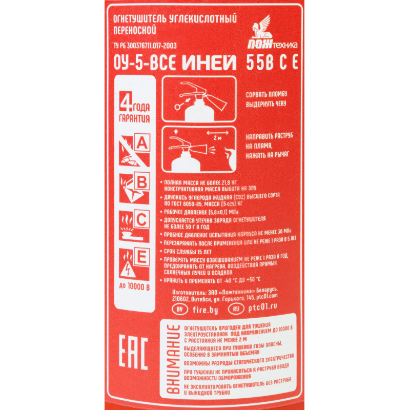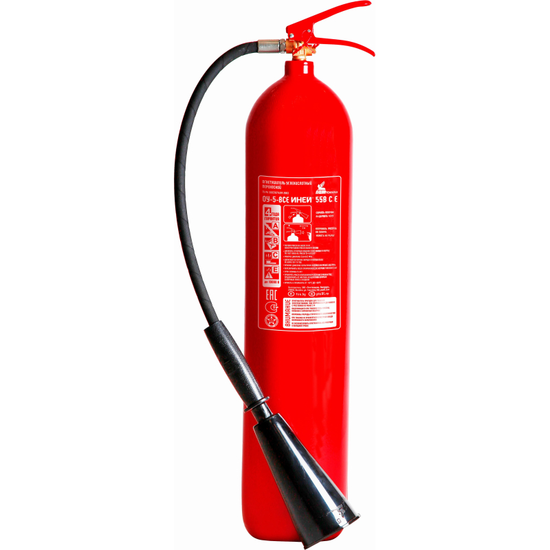 Огнетушитель углекислотный ОУ-5 Иней BCE - распространенный переносной огнетушитель с зарядом 5 кг двуокиси углерода высшего сорта и баллоном высокого давления по ГОСТ 949. Рекомендуется использовать в качестве дополнительного огнетушителя к основному, имеющему ранг 2А - для защиты общественных зданий и помещений категорий Г и Д, или имеющему ранг 4А - для защиты помещений категорий А, Б, В, при наличии в них электроустановок до 10 000 В. Рекомендуется использовать при температуре от -40 до +50 °C. Поскольку огнетушащим веществом является сухой газ, то при срабатывании огнетушителя не создается продуктов горения, не задымляется помещение, не наносится ущерб защищаемому имуществу, а также не создается препятствий для эвакуации людей, как при применении порошкового огнетушителя. Наиболее эффективен для защиты имущества, не имеющего риска порчи от воздействия низкой температуры (перепада температур). Огнетушитель способен подавать струю огнетушащего состава на расстояние не менее 3-х метров. Огнетушащая способность (ранг огнетушителя): 55В, С, Е (до 10 000 В). Вес огнетушителя: 17 кг. Вес огнетушащего вещества: 3 кг. Огнетушащее вещество: двуокись углерода высшего сорта. Баллон высокого давления по ГОСТ 949 на рабочее давление 15 МПа (150 атм). Объем баллона: 7.2 литра. Диаметр баллона: 115 мм. Время подачи огнетушащего вещества: 8 секунд. Площадь тушения: 1.76 кв.м. Паспорт баллона нанесен заводским клеймением по ТР ЕАЭС 032/2013. Гарантийный срок: 48 месяцев. Срок службы огнетушителя: 15 лет. Производитель: 'Пожтехника' Беларусь. Аксессуары: - подставка напольная Престиж арт.366664, 366665, 391384. Комплектация: распылитель, раструб, паспорт. Соответствует стандарту ГОСТ Р51057-2001. Перезарядка осуществляется через 5 лет с даты производства огнетушителя.