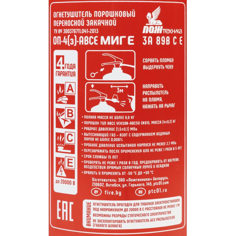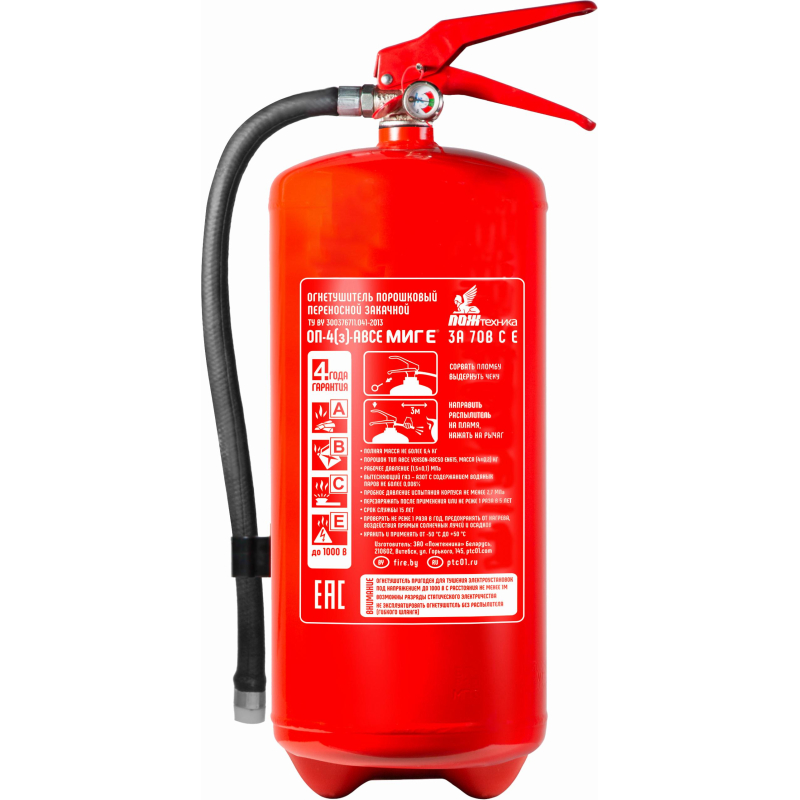 Огнетушитель порошковый ОП-4(з) ?Миг? E ABCE - закачной огнетушитель с повышенной огнетушащей способностью улучшенной конструкции: значительно увеличенная толщина стенки баллона; запорно-пусковое устройство снабжено предохранительным клапаном, обеспечивающим сброс избыточного давления (при нагреве); в гнезде индикатора давления предусмотрен ниппель, обеспечивающий запирание от стравливания давления при замене индикатора; конструкция индикатора исключает стравливание давления при повреждении (разбитии) стекла - сохраняется работоспособность огнетушителя. Рекомендуется использовать при температуре от -50 до +50 °C. Огнетушитель способен подавать струю огнетушащего состава на расстояние не менее 3-х метров. Огнетушащая способность (ранг огнетушителя): 3А, 70В, С, Е (электроустановки под напряжением до 1000 В). Вес огнетушителя: 6.3 кг. Вес огнетушащего порошка: 4 кг. Марка порошка: Вексон-АВС 50. Время подачи огнетушащего вещества: 10 секунд. Площадь тушения: 13.89 кв.м. Объем баллона: 5 литров. Диаметр баллона: 147 мм. Паспорт баллона нанесен заводским клеймением по ТР ЕАЭС 032/2013. Гарантийный срок: 48 месяцев. Срок службы огнетушителя: 15 лет. Производитель: ?Пожтехника? Беларусь. Аксессуары: - настенный кронштейн ?Миг? арт.366662; - подставка напольная Престиж арт.366664, 366665, 391384; - транспортный кронштейн КТР-4/5 ?Миг? арт. 366665. Комплектация: распылитель, паспорт. Соответствует стандарту ГОСТ Р51057-2001. Перезарядка осуществляется через 5 лет с даты производства огнетушителя.