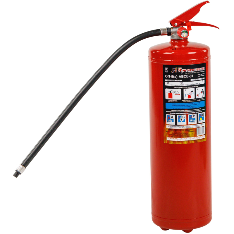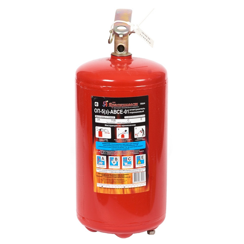 Огнетушитель порошковый ОП-5 (з) АВСЕ предназначен для защиты помещений производственного и хозяйственного назначения, применения на автомобильном, железнодорожном, речном транспорте, морских судах и в бытовых условиях в качестве первичных средств тушения пожаров классов А (твердых горючих веществ), В (жидких горючих веществ), С (газообразных горючих веществ) и электроустановок, находящихся под напряжением до 1000 В. Огнетушитель не предназначен для тушения загораний щелочных и щелочноземельных металлов и материалов, горение которых может происходить без доступа воздуха. Рекомендуется использовать при температуре от -50 до +50 °C. Огнетушитель способен подавать струю огнетушащего состава на расстояние не менее 3-х метров. Огнетушащая способность (ранг огнетушителя): 2А, 70В, С, Е (электроустановки под напряжением до 1000 В). Рабочее давление: 1.4+0.2 МПа. Вес огнетушителя: 6.92 кг. Вес огнетушащего порошка: 5 кг. Марка порошка: 'Триумф'. Время подачи огнетушащего вещества: 10 секунд. Площадь тушения: 9.36 кв.м. Высота огнетушителя: 520 мм. Диаметр баллона: 133 мм. Вес пустого баллона: 1.4 кг. Гарантийный срок: 18 месяцев. Срок службы огнетушителя: 10 лет. Производитель: 'Ярпожинвест'. Комплектация: огнетушитель заряженный с опломбированным ЗПУ со шлангом с распылителем, руководство по эксплуатации, объединенное с паспортом, шланг с распылителем с насадкой. Соответствует стандарту ГОСТ Р51057-2001. Внимание! Есть индикатор. Огнетушитель относится к сегменту 'эконом'. Качество соответствует заявленным характеристикам и стандарту ТР ЕАЭС 043/2017 'О требованиях к средствам обеспечения пожарной безопасности и пожаротушения'. Возможность получения компенсации от ФСС на основании наличия заключения Минпромторга РФ на этот артикул не распространяется. Перезарядка осуществляется через 5 лет с даты производства огнетушителя.